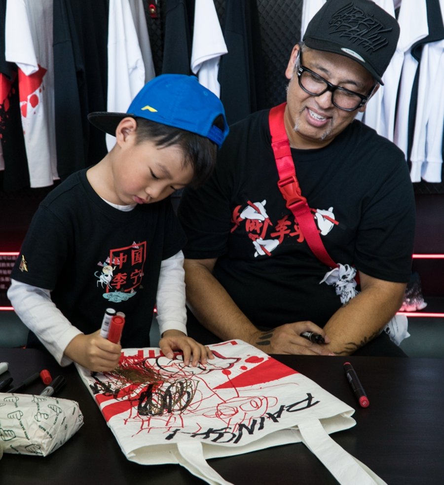 随后 OG SLICK 亲自指导小朋友进行涂鸦创作。他并非手把手教小朋友绘画,而是希望授人以渔,鼓励他放飞自我。这也揭示了他此次联名的初衷,那就是将自己勇于表达的原创精神带给中国的年轻人。