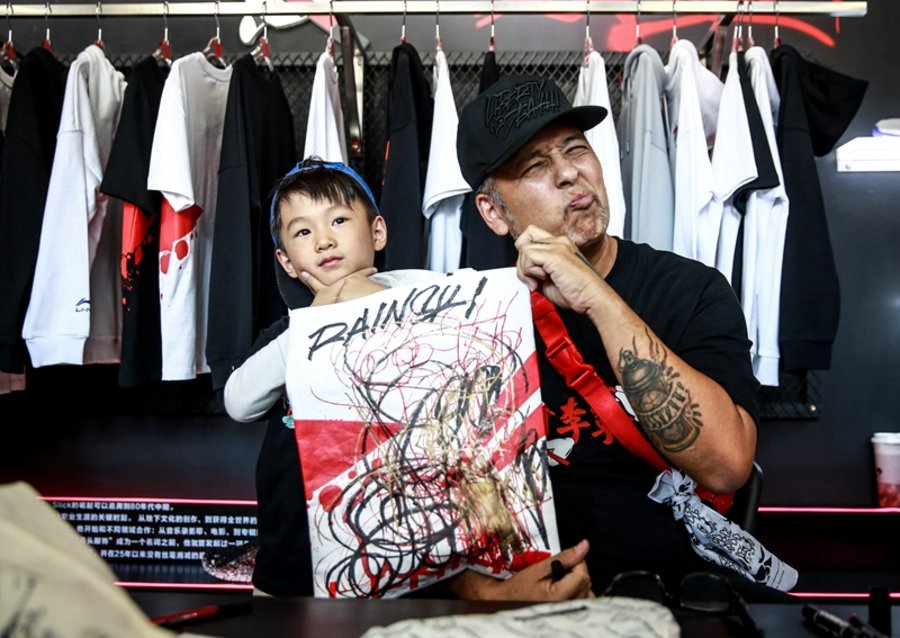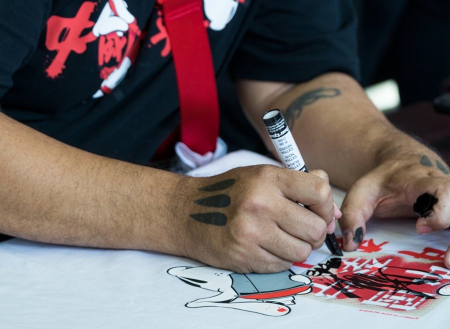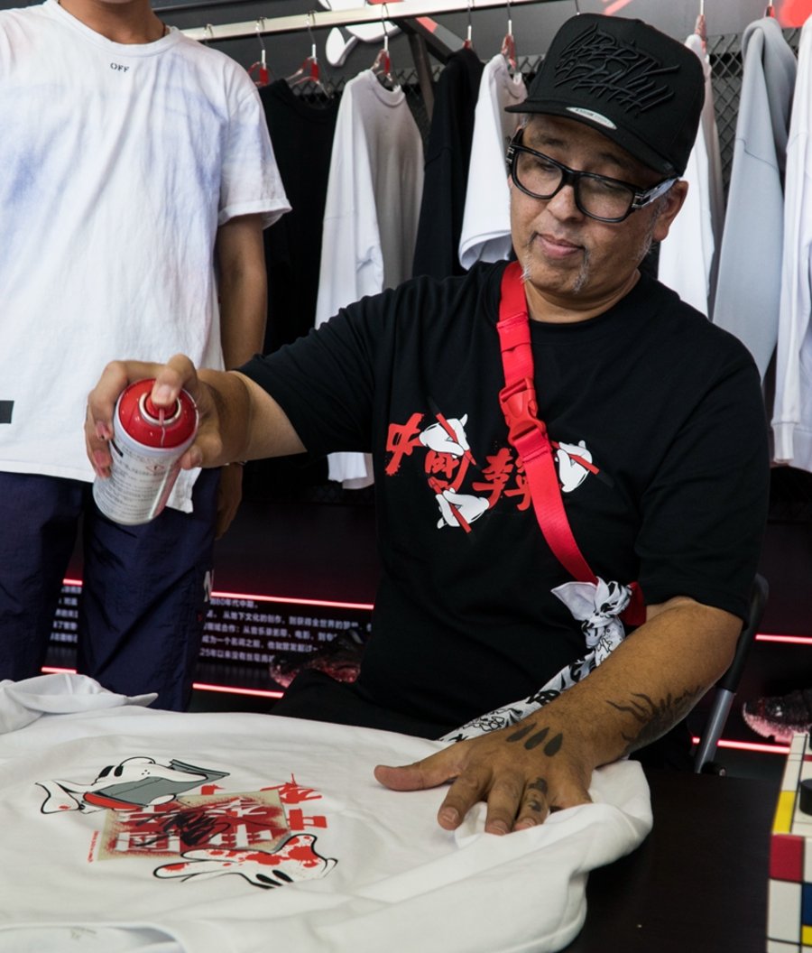 接下来 OG SLICK 为幸运粉丝耐心签售。与其说是签名,不如说是在单品上进行二次创作。OG SLICK 在签名之后,还会用喷漆在服饰上进行喷绘,为每位粉丝打造独一无二的定制版本。