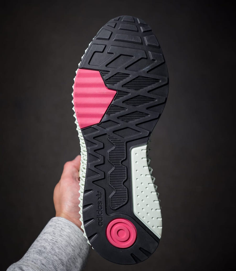 光看鞋名就可以看出,鞋面以经典跑鞋 ZX 4000 为蓝本打造。为了带来更好的穿着脚感并适应 4D 的前卫风格,鞋面将材质改为 Primeknit 编织,并加入皮革拼接补强,造型颇具解构风格。