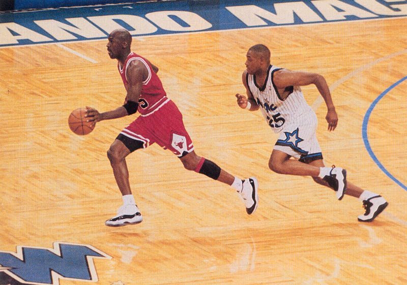 94-95 赛季东部决赛首战 45 号乔丹上脚 Air Jordan 11 “Concord”,关键时刻,成功抢断乔丹的魔术名宿 Nick Anderson,恰好穿的就是即将复刻的这双 Air Jordan 10 “Orlando”。