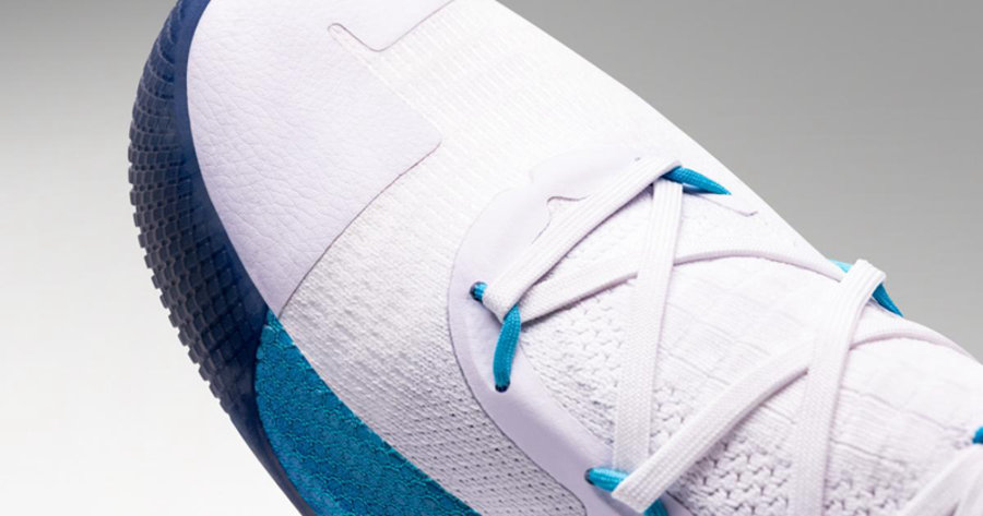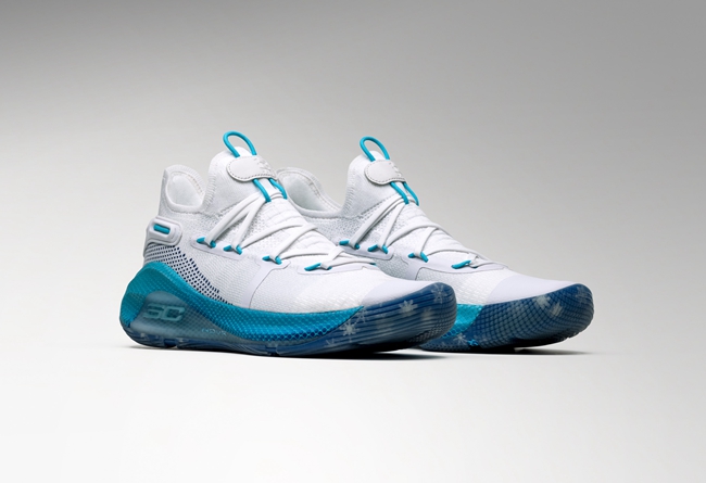纯白鞋面搭配北卡蓝鞋底及鞋带扣,鞋垫与外底辅以充满童真的手绘雪花图案点缀,致敬库里在北卡罗来纳州度过的童年时光。