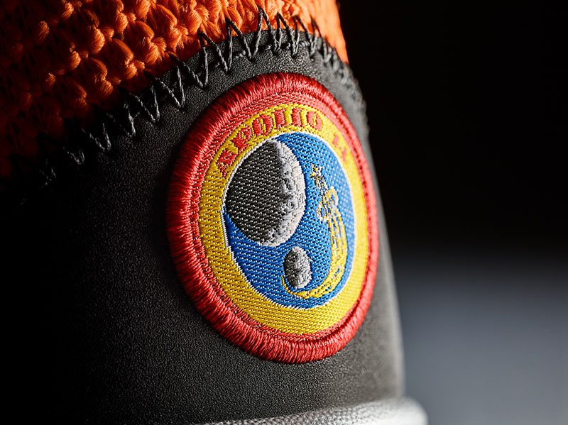 乔治以家乡 NASA 研究中心为配色灵感,印在鞋后跟处的文字来源于人类对月球的探索,也是乔治最爱的格言之一:Don't tell me the sky's the limit when there are footprints on the moon。