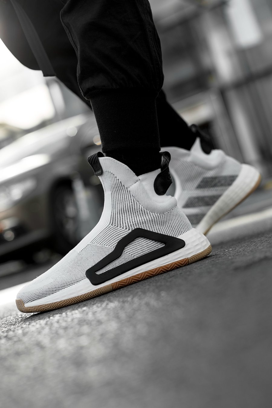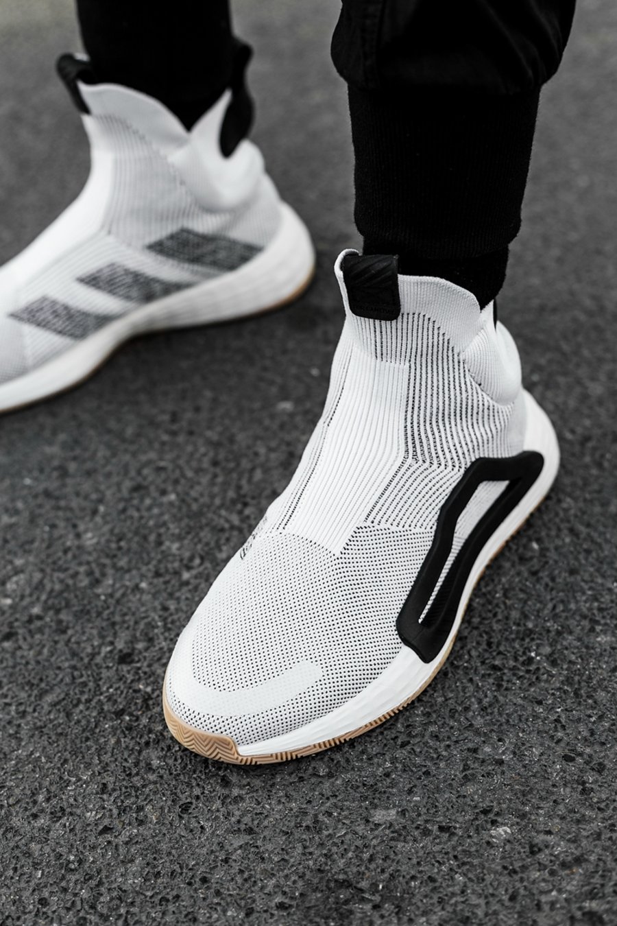 作为 adidas 历史上,第一款真正意义上完全没有鞋带构造的篮球鞋,adidas N3XT L3V3L 整体设计语言非常简洁,犹如一艘未来的飞行器,流畅的鞋身线条与夸张的高帮造型,让人过目不忘。