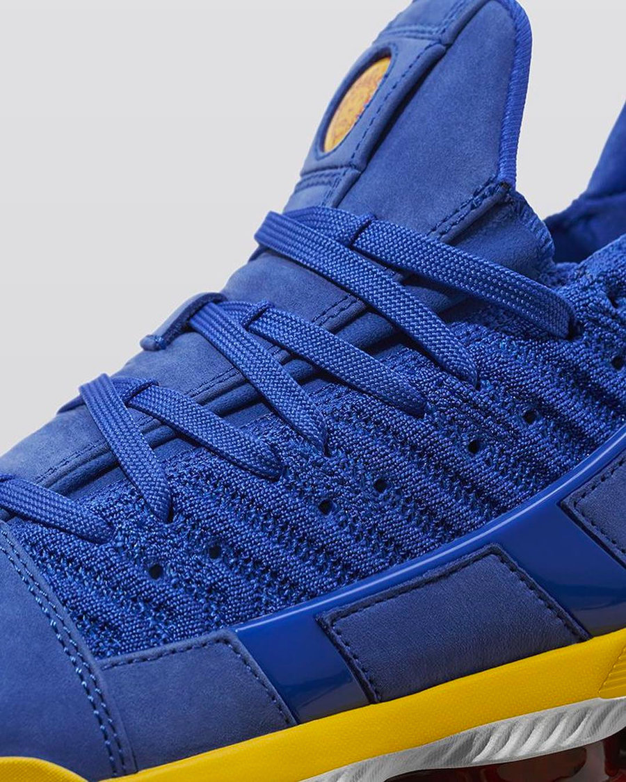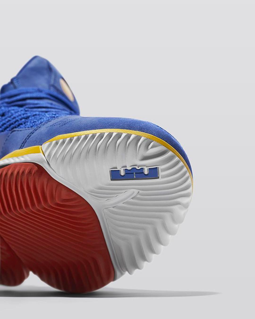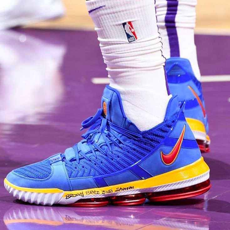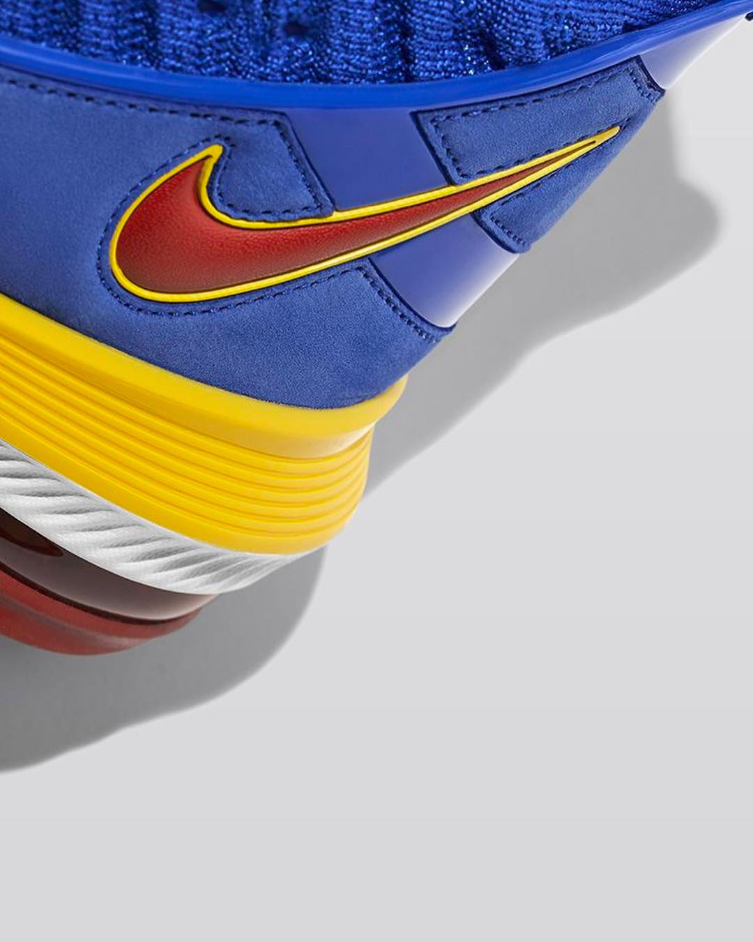 而今天詹姆斯本人就为我们带来了亲着上脚,蓝色主色调贯穿鞋身,红色的 Swoosh,以及黄色和白色的中底效果都让这双鞋颇具活力,吸睛效果不错。