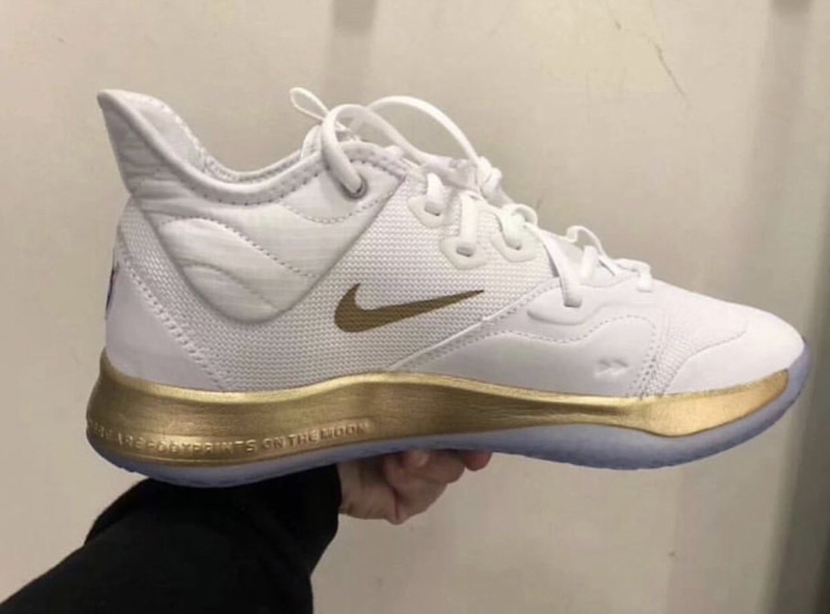 近日,网络浮现一组实物图片,鞋身采用清爽的白色为主调,搭配香槟金中底。但 Nike Swoosh 并非为泡椒 PE 的白色,而同样以金色呈现,后跟则采用阿波罗登月任务的 Logo 示人!