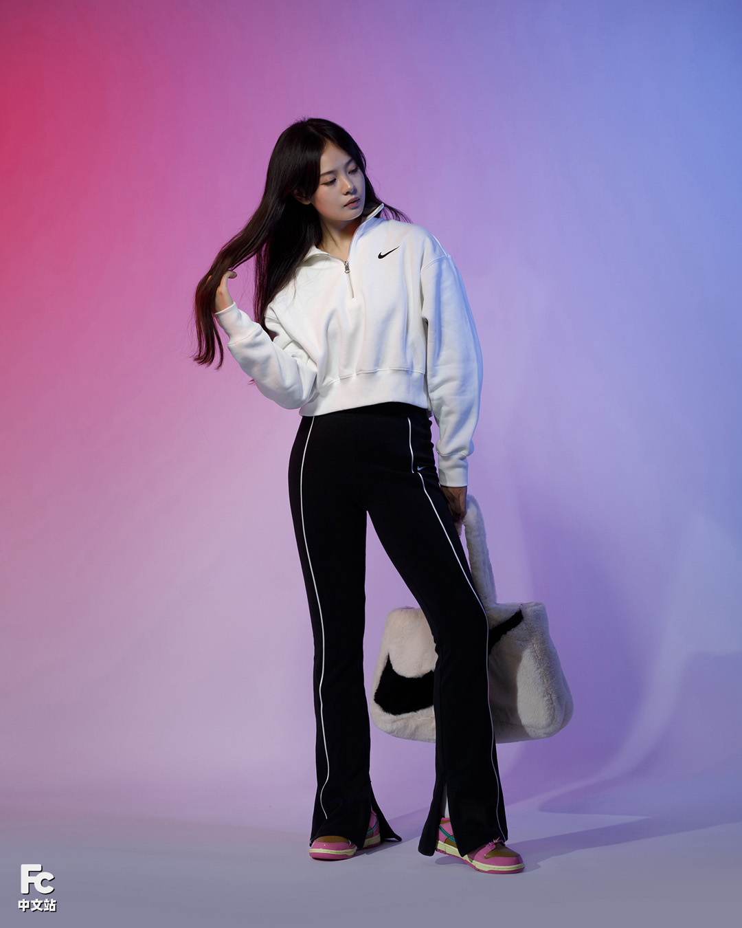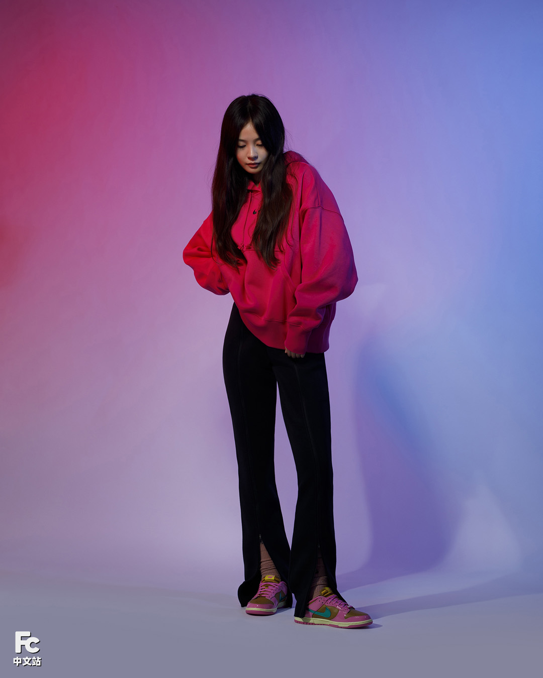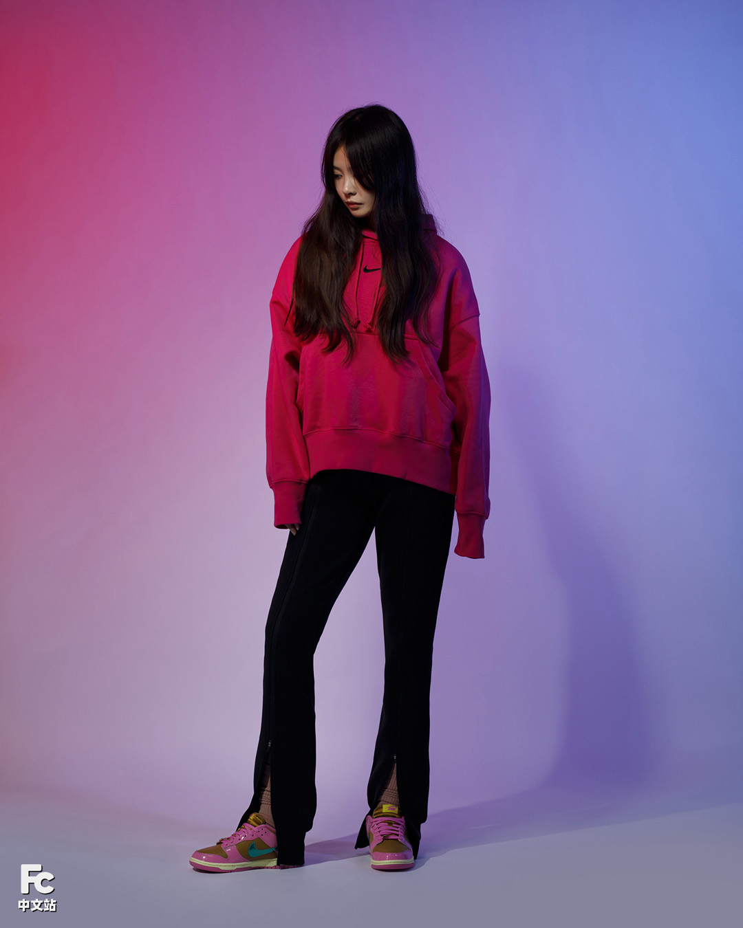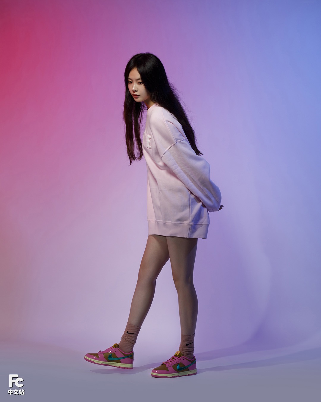 Oversize 版型能有效显瘦,淡粉色也能衬托脚下的 Dunk Low Parris Goebel Quick Strike,如今女生圈子中学习街舞、韩舞的风潮正盛,这身也可以作为舞蹈练习的穿搭。