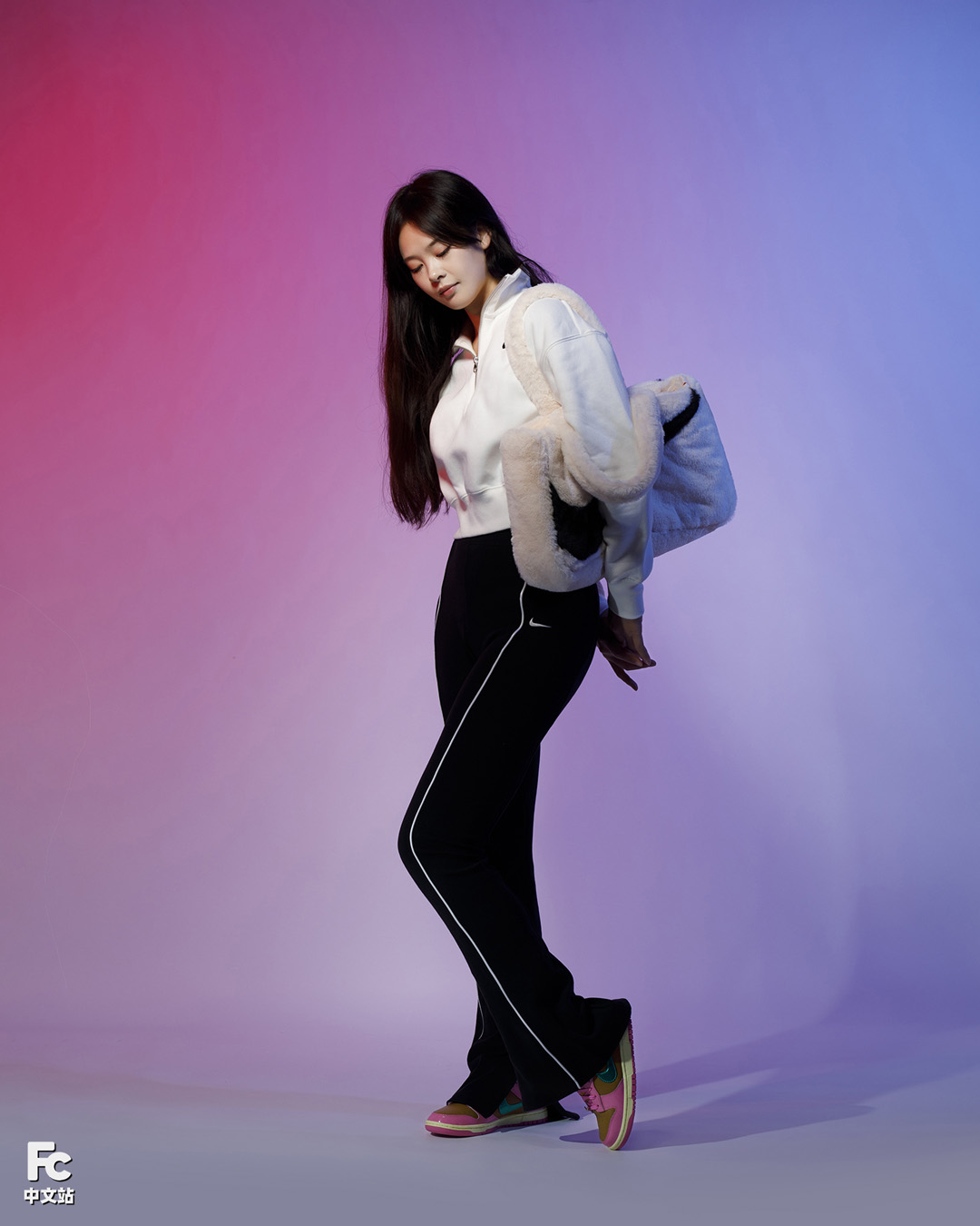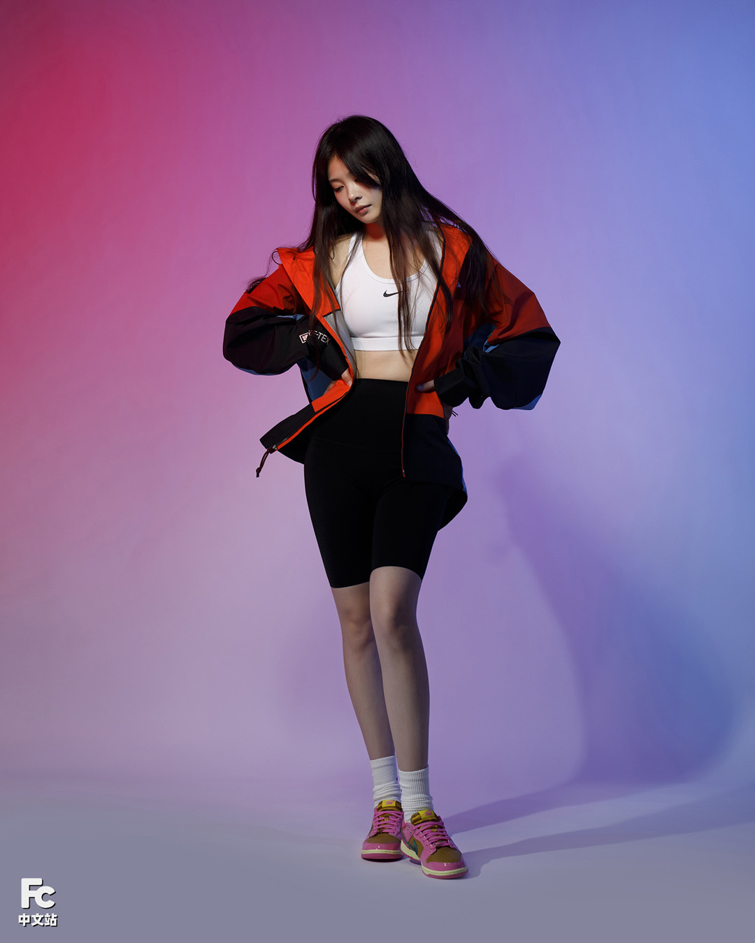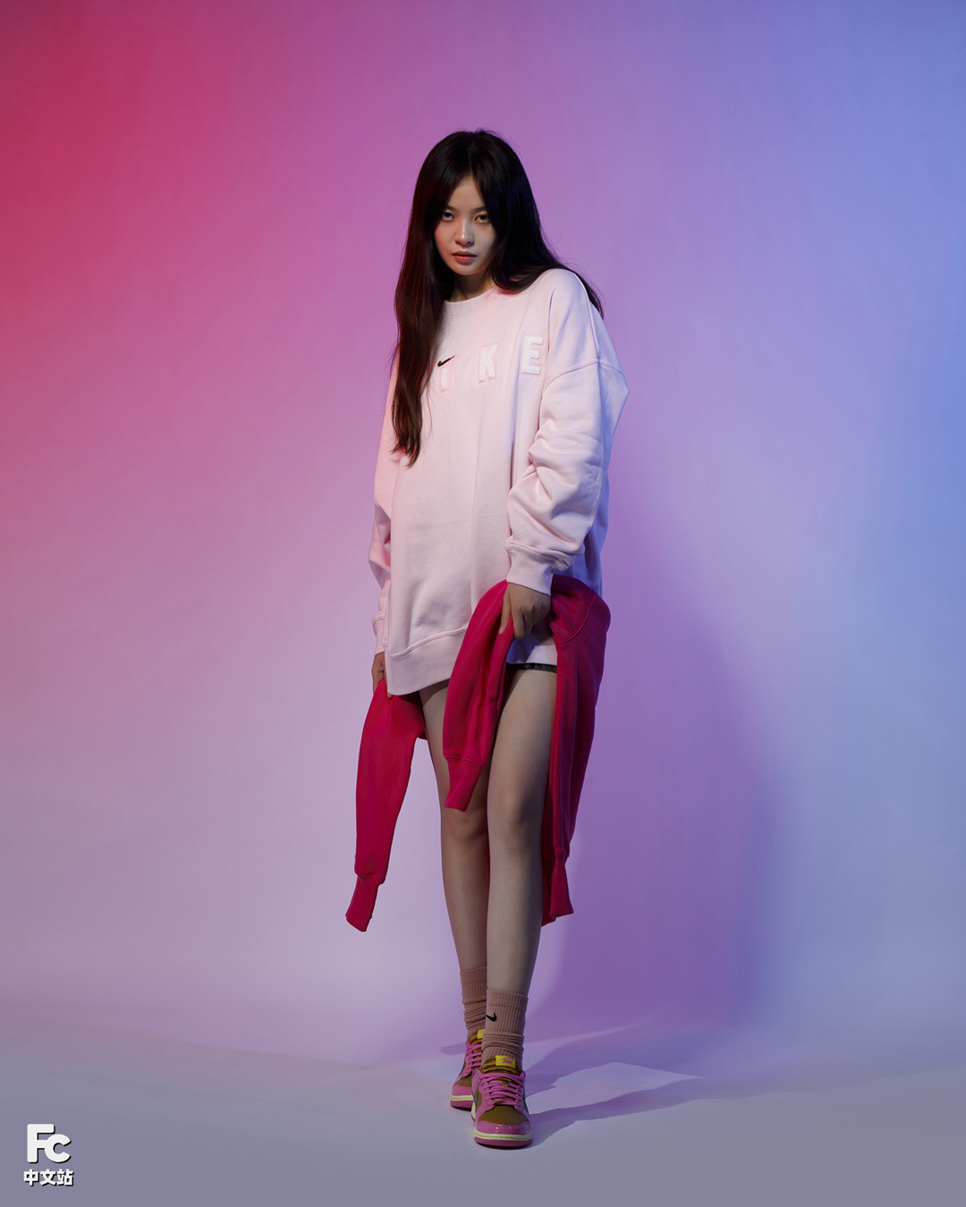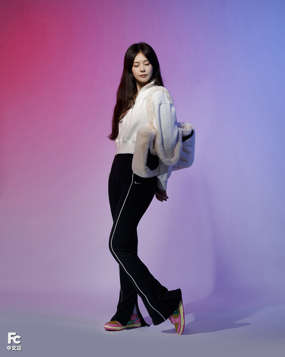 Oversize 版型能有效显瘦,淡粉色也能衬托脚下的 Dunk Low Parris Goebel Quick Strike,如今女生圈子中学习街舞、韩舞的风潮正盛,这身也可以作为舞蹈练习的穿搭。