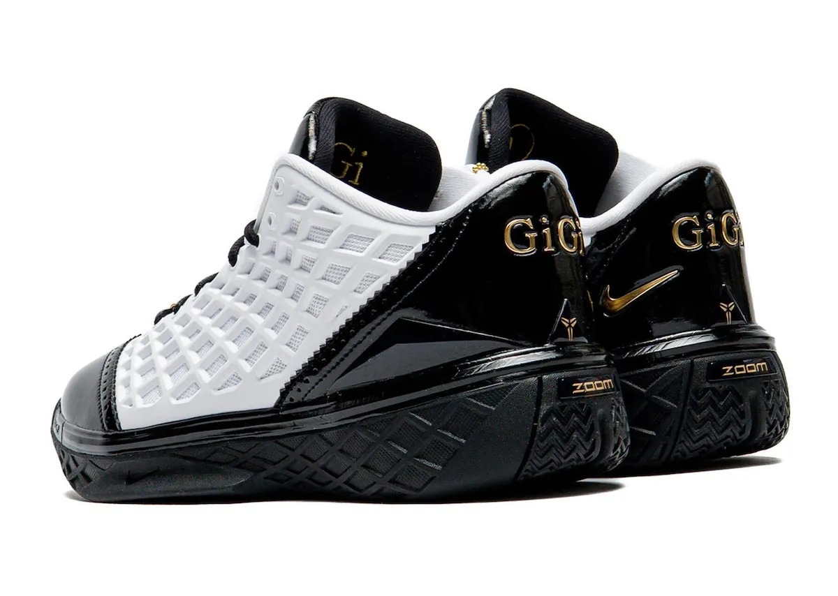 这款新鞋的配色灵感源自 Gigi 的曼巴学院球衣,整体采用白、黑、金属金三色呈现。