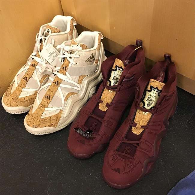 无论是白色的 adidas Top Ten 2000 还是酒红色的 adidas Crazy 8,都以葡萄酒软木塞纹理装饰。而洛瑞的附言 Vino Kobe Pack 则表明了这一对球鞋的身份。Vino 是科比在 2013 年收获的全新昵称,在意大利语里是红酒的意思。