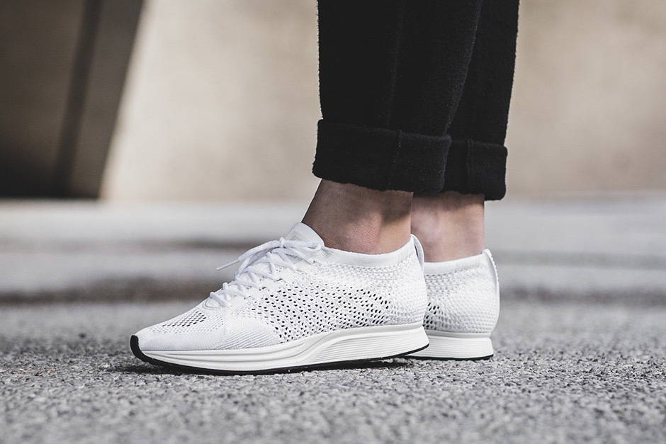 这双名为 Nike Flyknit Racer “Goddess” 从鞋身到鞋底到各项细节都采用了纯白色打造,但通过 Flyknit 的精细编织,鞋身侧边的 Swoosh 依然若隐若现,保留了品牌的经典元素。