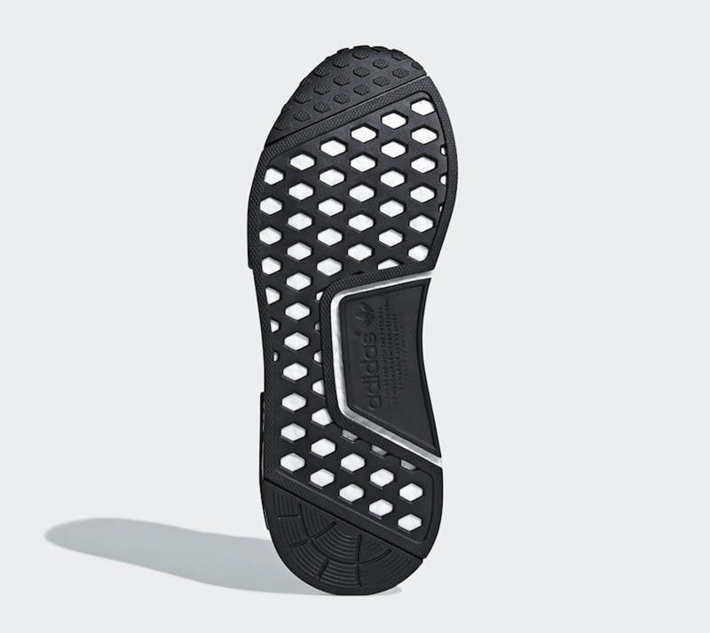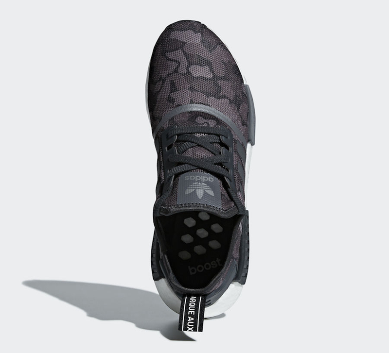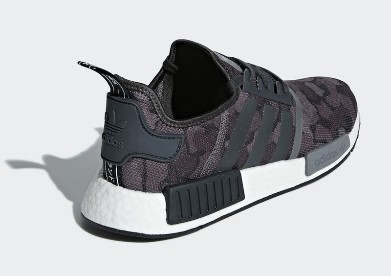 最近 adidas 释出一款新品 NMD R1。配色近似 BAPE 联名黑色迷彩款,同时将侧面三道杠颜色换为黑色,NMD 标志性的稳定块颜色也与联名款正好相反。