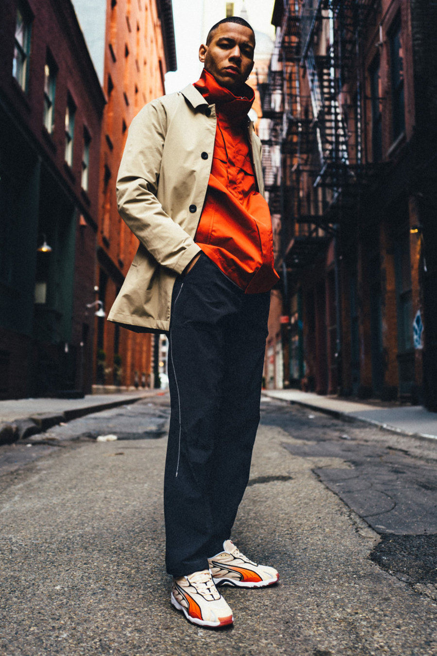这双鞋以标准的流线型复古老爹鞋款出现,整体亮橙色与米白色的搭配更加适合夏天。