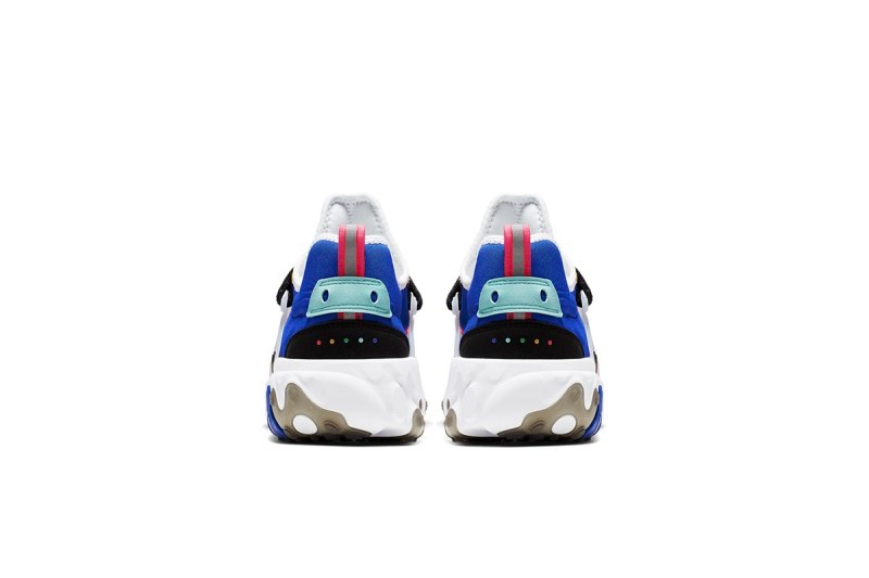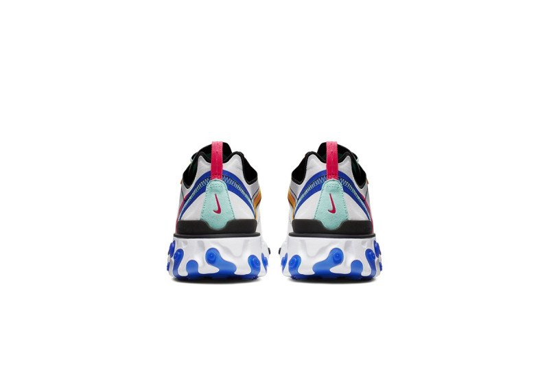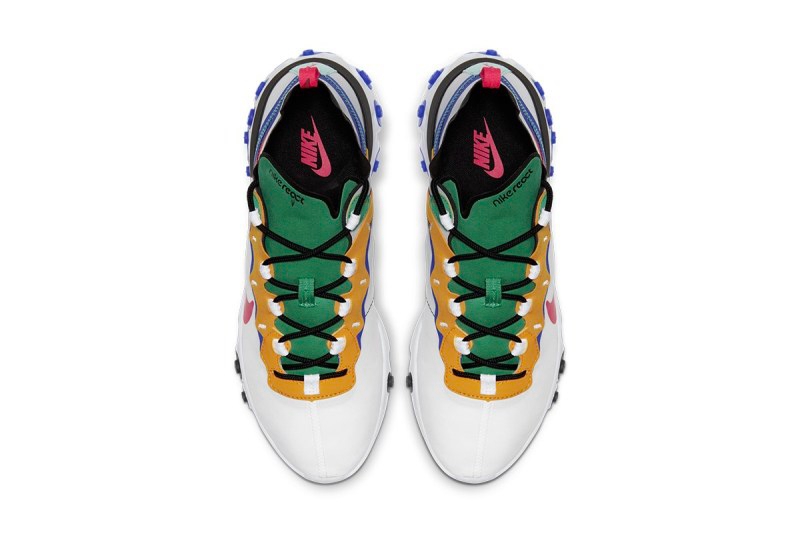 Nike React Element 55 采用白色作为主色调,细节辅以红、蓝、黄、绿四色进行点缀,中底搭载 React 缓震科技,清爽百搭的同时还具备不错的脚感。