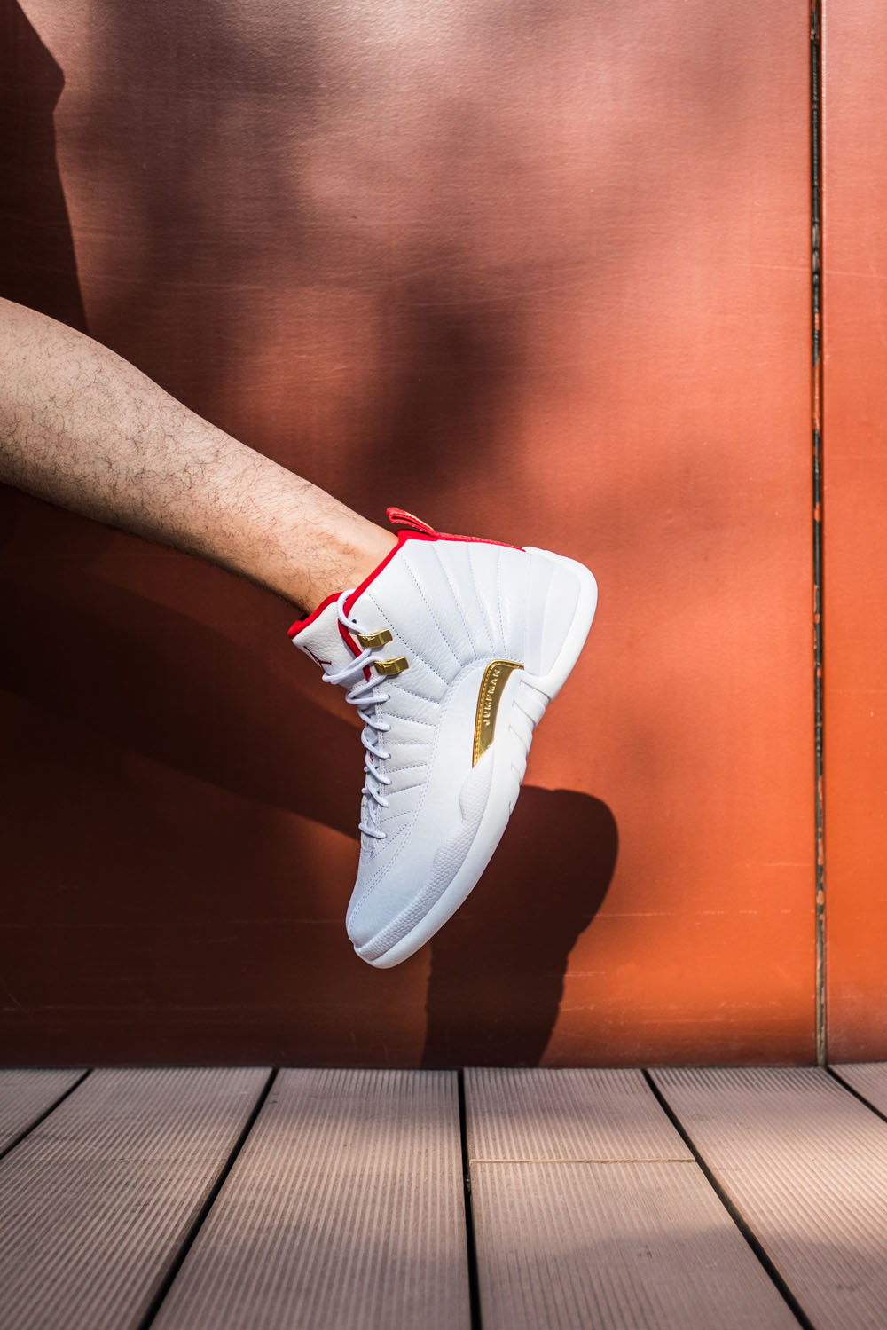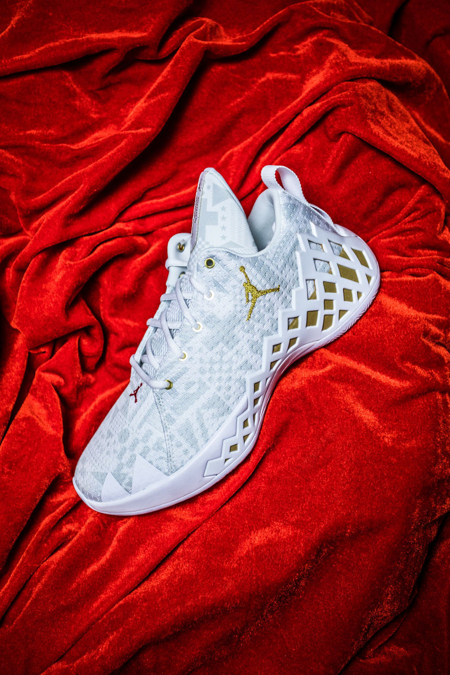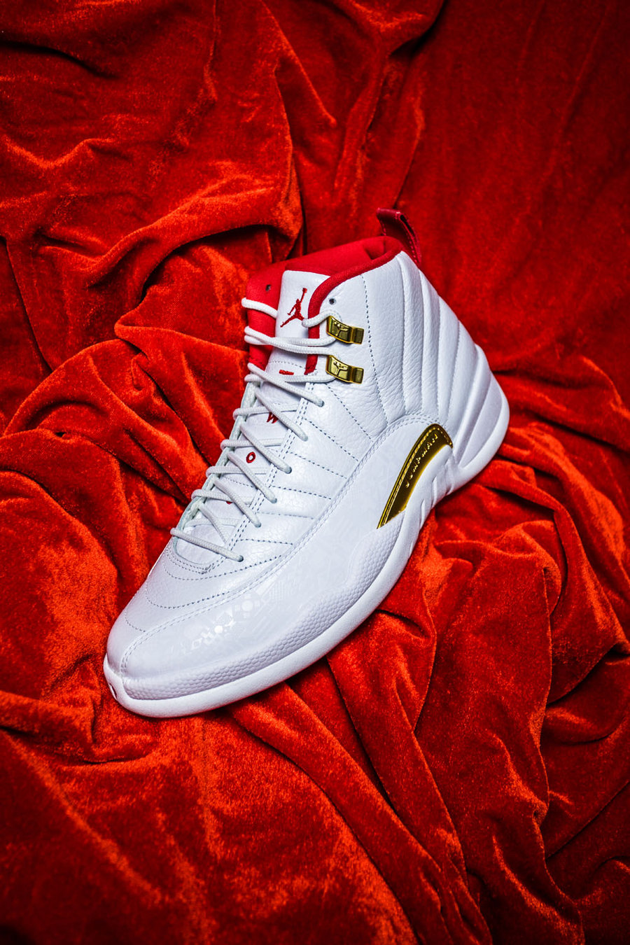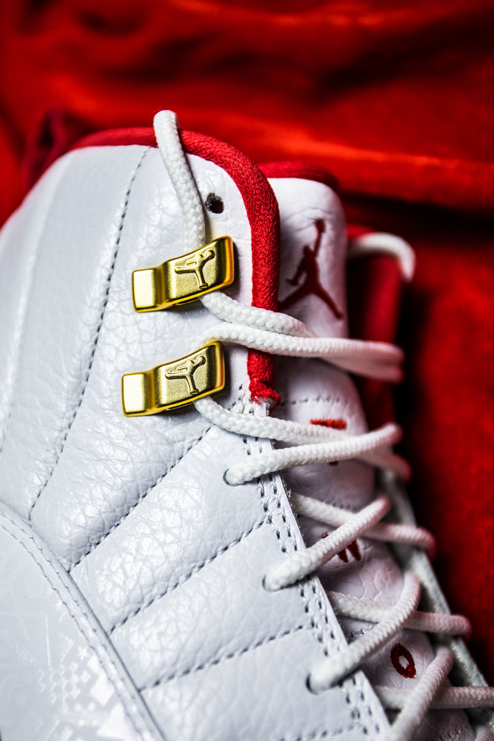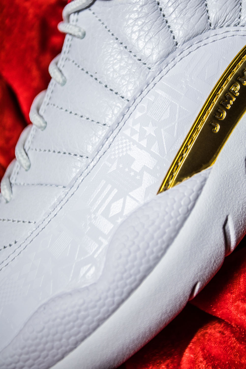 这双 Air Jordan 12 以白色为主色调,金色、红色点缀其上,国旗元素暗纹表现在这款鞋的外侧拼接部分。