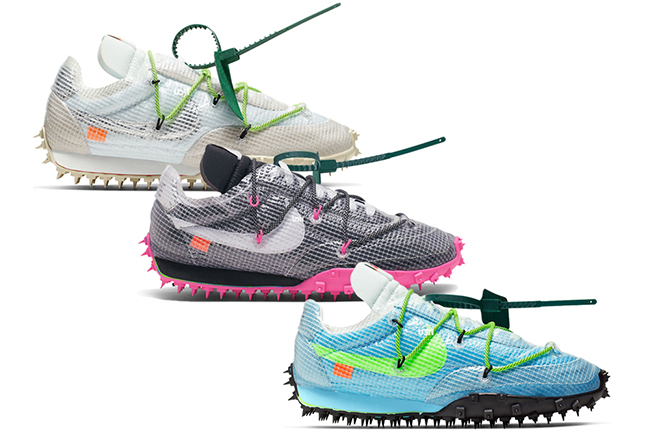 此次合作依旧采用 OFF-WHITE 极具代表性的设计风格,配色分为黑粉、白绿、蓝绿三种方案,与此前的 OFF-WHITE x Nike Zoom Kiger 5 相同。