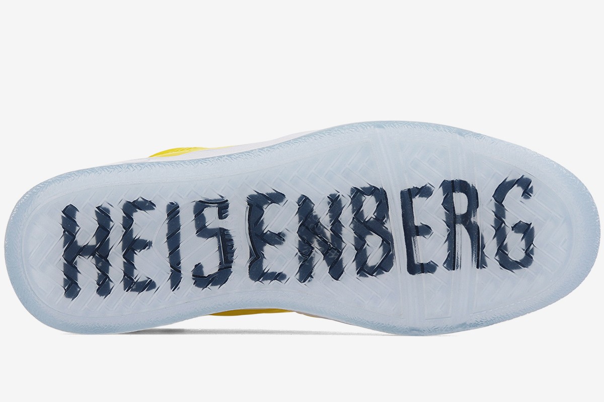设计采用双层鞋面,两款配色分别使用黄色和橙色的外层鞋面包裹,内层鞋面则是白色与黑色皮革材质,拉链与后跟等细节都加入《绝命毒师》元素。