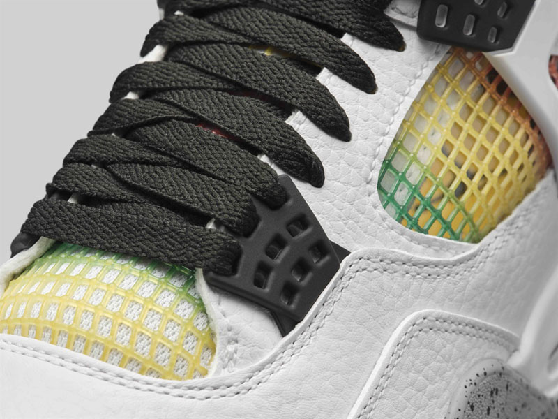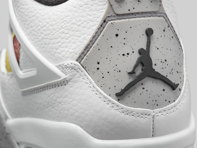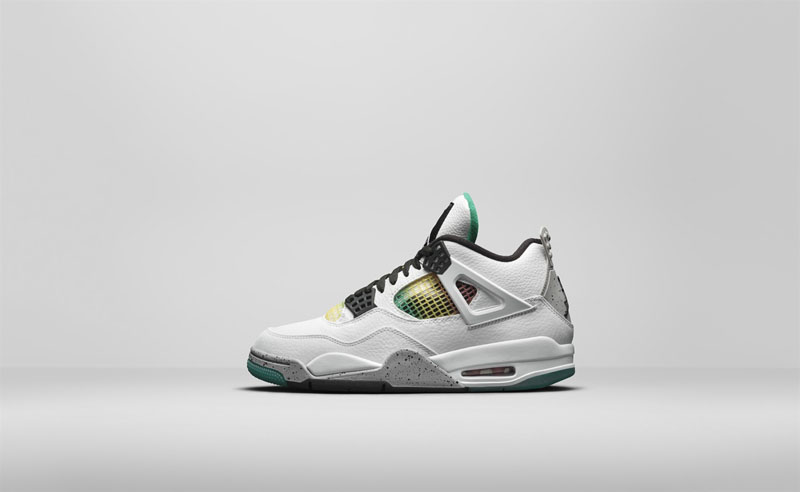 Jordan 一口气带来四双全新配色的 Air Jordan 4,均采用全白色鞋面,分别以紫、红、绿和橙四种颜色融入金属质感作为细节装饰呈现,确实适合夏天。
