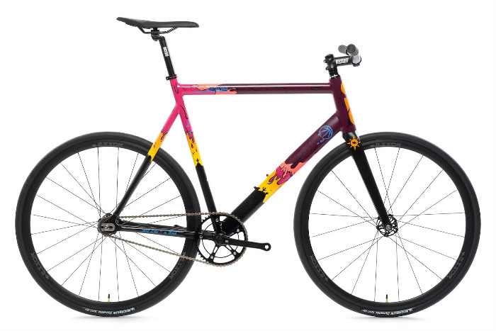 除此之外,还特别涂装了一辆 State Bicycle.co Black Label 6061 死飞自行车与之搭配,同样的设计元素呈现于车架之上,并在细节点缀太阳、篮球等元素,令人相当羡慕!