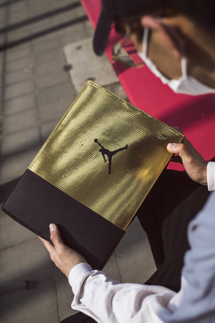 鞋带扣与鞋身正面的飞人 Logo 都以金色呈现,与中底的金色涂装呼应,华丽装饰格外引人瞩目。