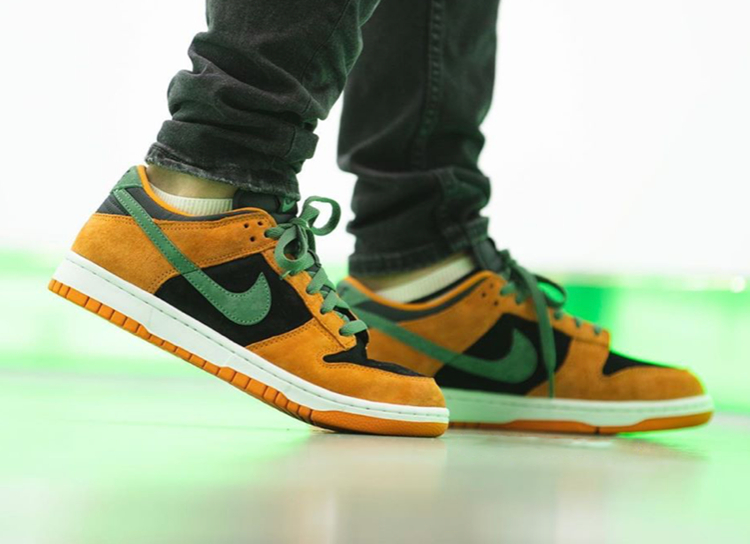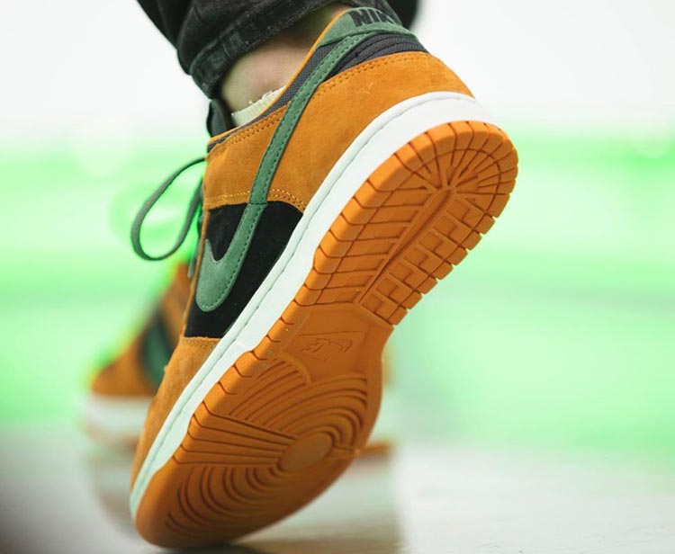 黑色鞋面搭配橙色鞋身框架,墨绿色点缀 Swoosh Logo 和鞋带等细节,整体配色看起来有点像胡萝卜,醒目的颜色碰撞延续了 Dunk 的一贯风格。