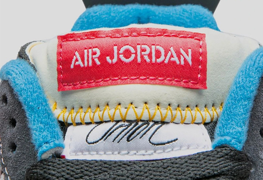 原本在鞋舌内侧倒置的 “AIR JORDAN” 缝标可以显露而出,鞋舌使用缝线固定,如果把缝线拆除就能变成 Air Jordan 4 传统的长鞋舌,并露出熟悉的 Jumpman 和 Union Logo,可玩性颇高。