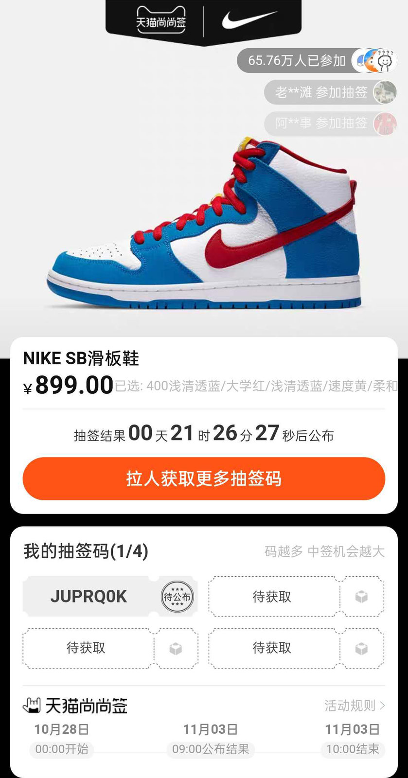 明早 9 点 SNKRS 发售,天猫 Nike 官方旗舰店也将再度发售,今天已经开启抽签,明早公布结果。
