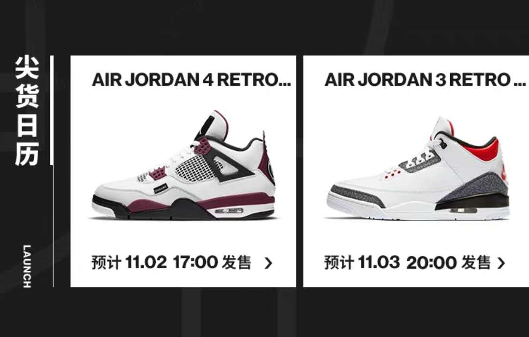 目前已有大巴黎 Air Jordan 4、新火焰红 Air Jordan 3 预告,分别将在今晚 17:00 和明晚 20:00 发售。