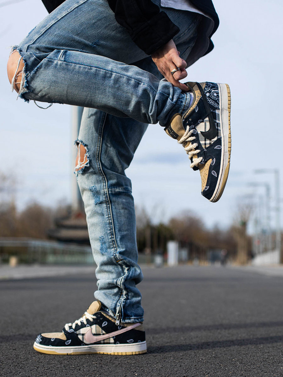 第一双就是这款颜值、话题度都不缺的 Travis Scott x Nike Dunk SB Low,当时由于疫情原因以及 SNKRS 不发等诸多原因,市场价堪比坐火箭,一路飞涨。