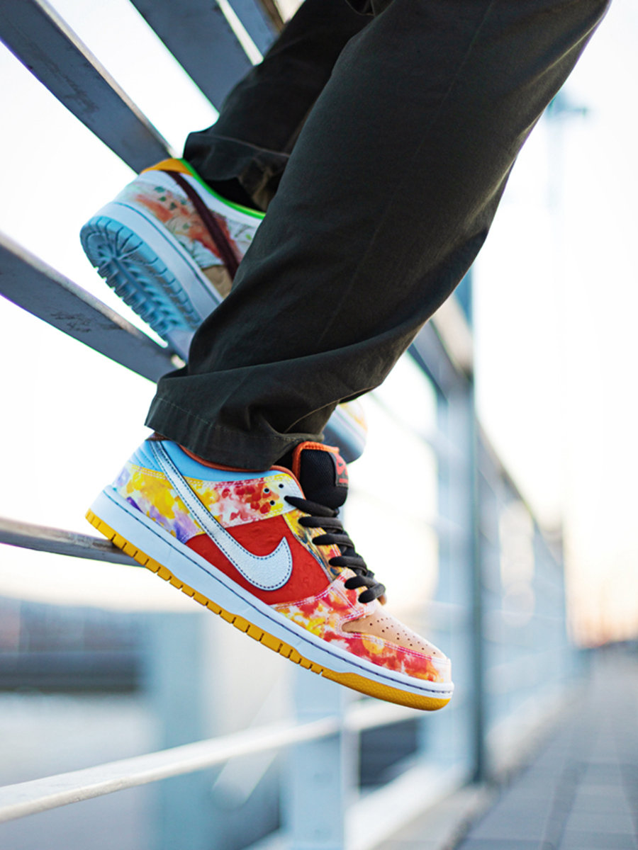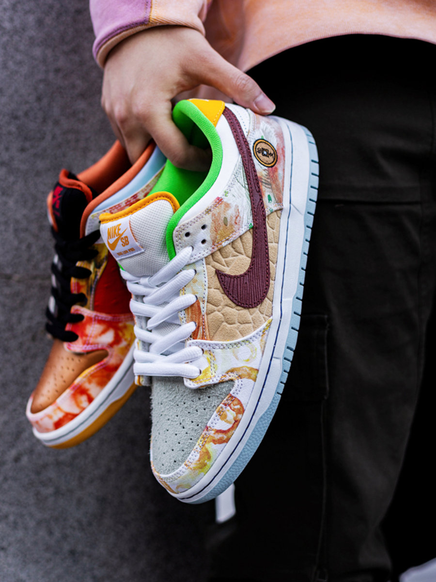 由国内艺术家杰凸凸打造的这款中国主题「美食 Dunk」俘获了不少国内玩家的芳心,通过不对称鸳鸯设计将许多街头美食注入鞋身,市价曾一度破万。