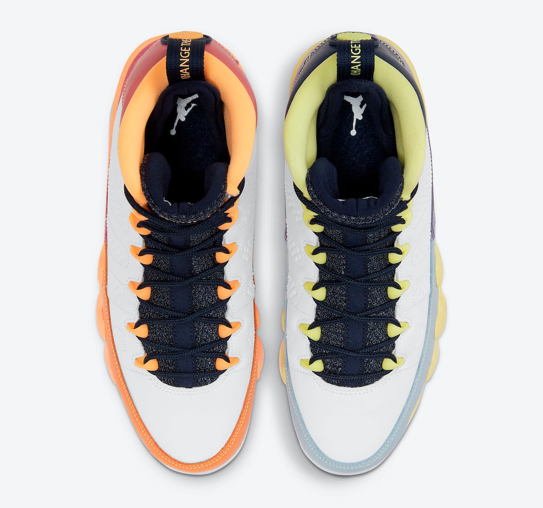 整双鞋采用鸳鸯设计,简洁的纯白鞋面辅以多种色彩拼接提升辨识,打破了 Air Jordan 9 的传统风格,为硬朗的造型加入超强活力。