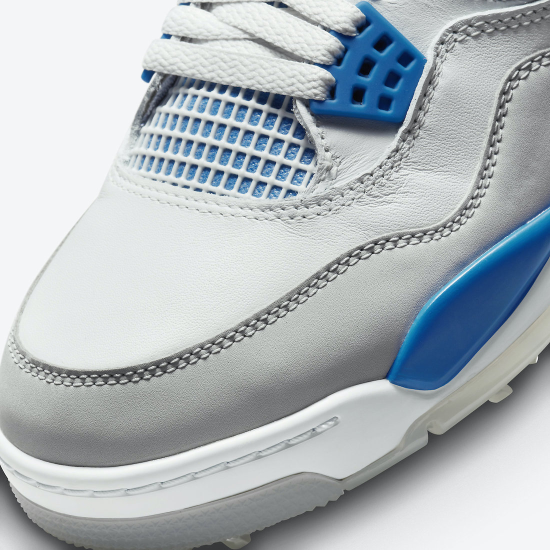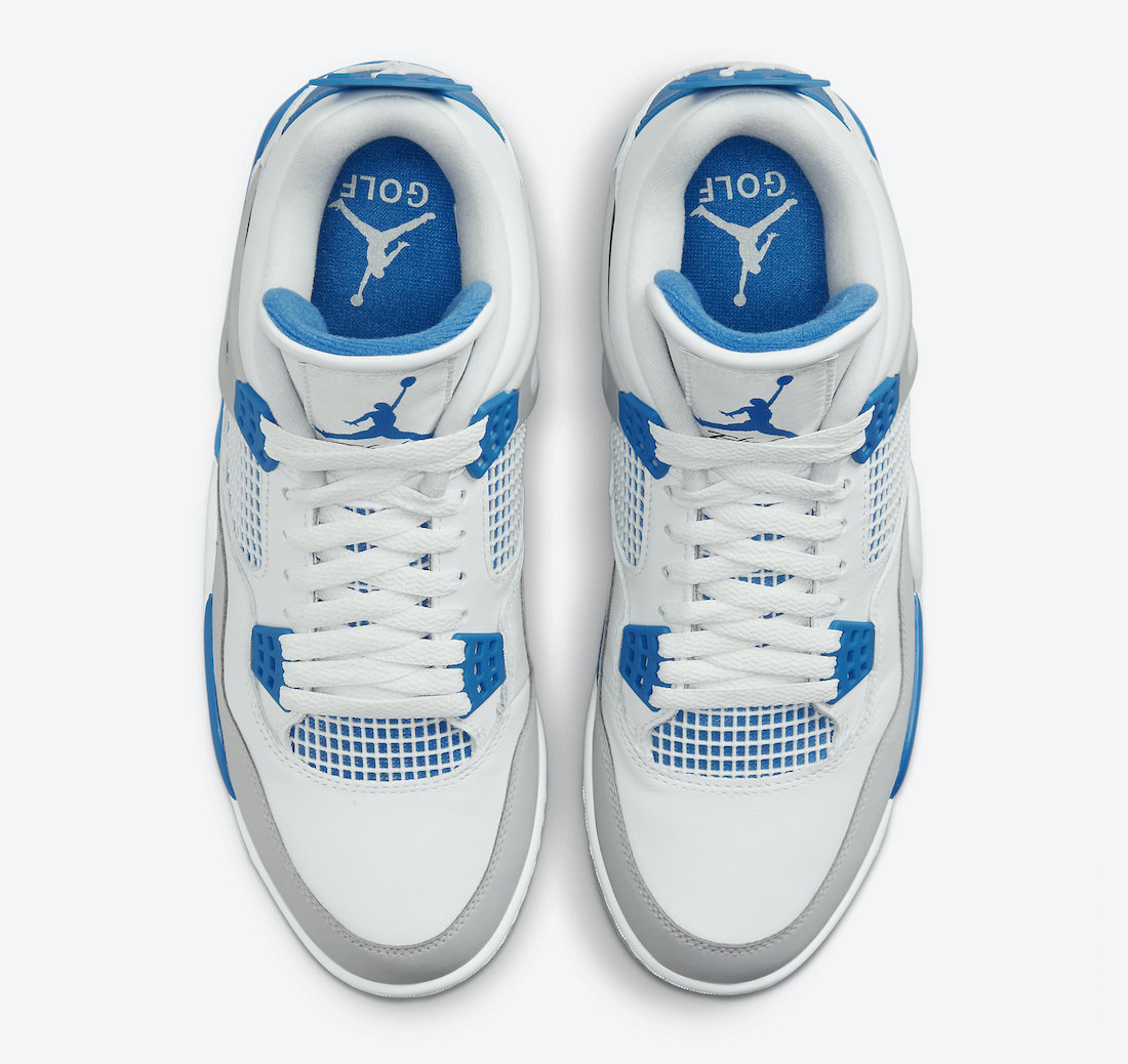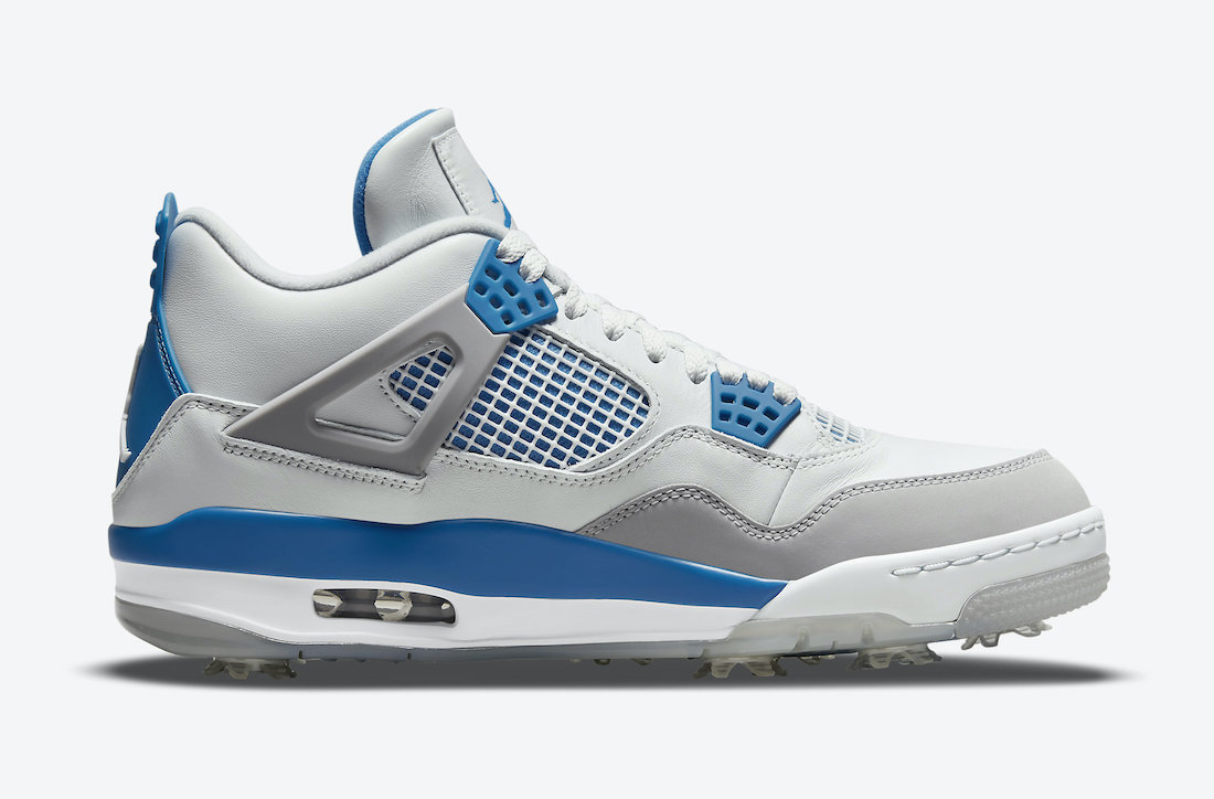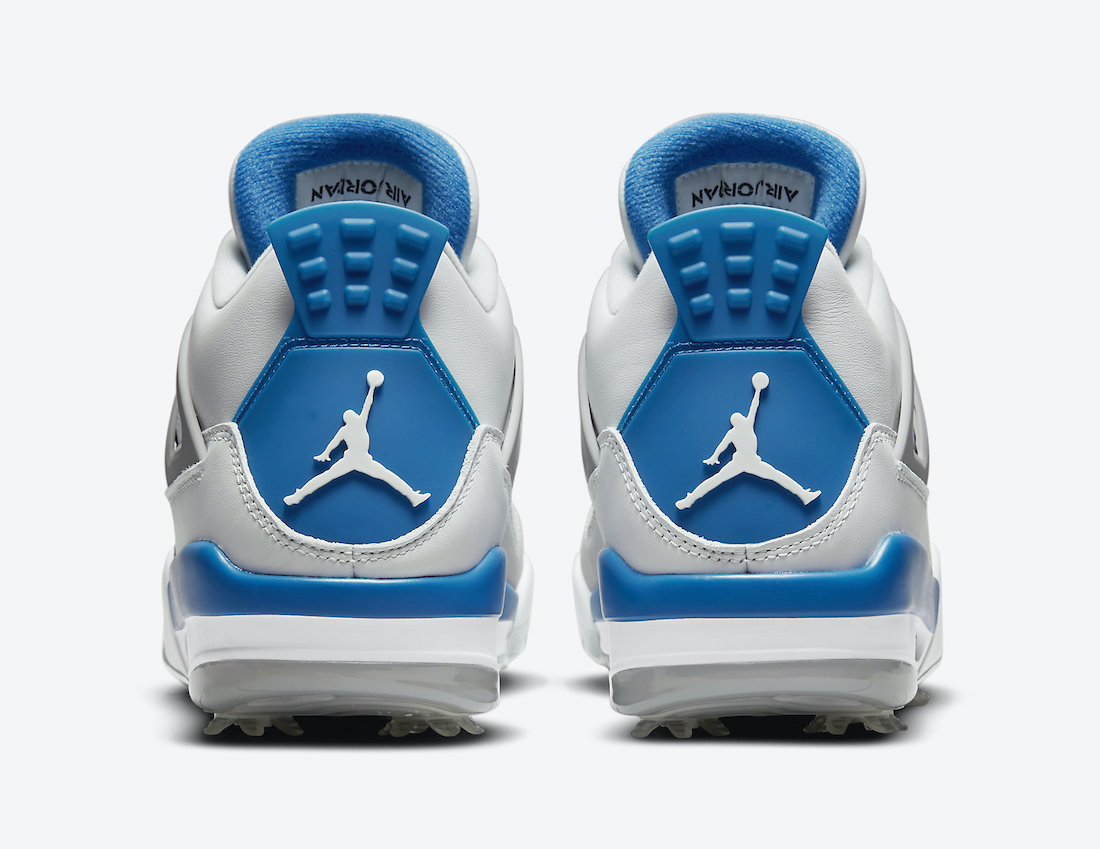此前曾在 2006 年和 2012 年复刻,到现在已经九年时间。虽然今年发售信息迟迟没有更新,但近日一双高尔夫鞋版的 Air Jordan 4 Golf “Military Blue” 率先出现。