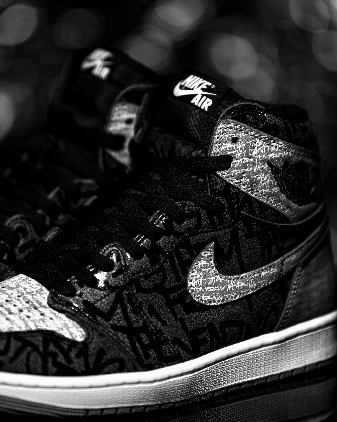 整鞋最引人注目的莫过于黑灰色调下鞋身满印「They can’t stop you from wearing them(他们不能阻止你穿上这鞋)」字样,传承禁穿的叛逆与张扬个性的核心精神。