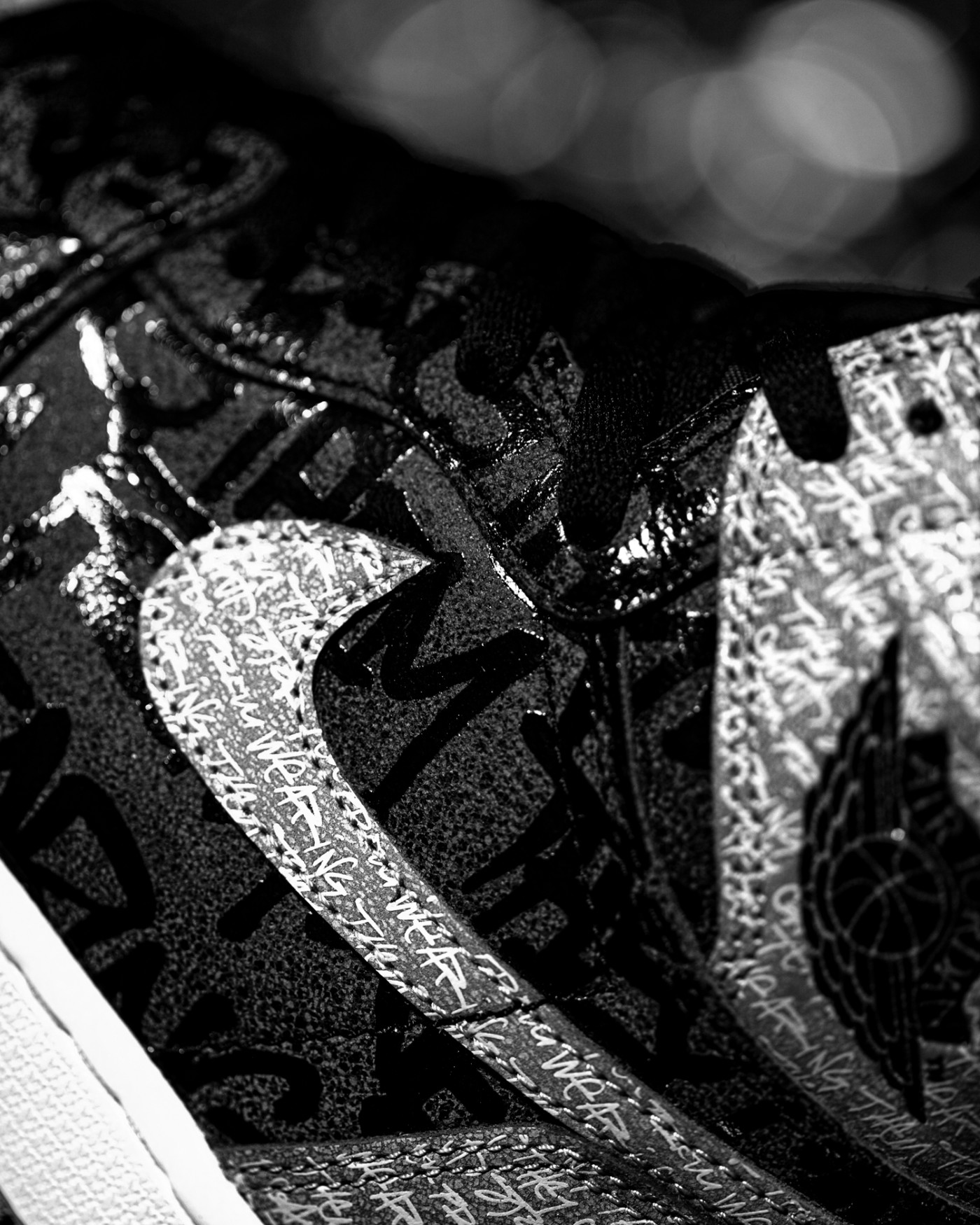 鞋身中段的涂鸦从小手写字体转换为大号油漆涂鸦字体,亮面材质的加入也让整双鞋多了一层低调的奢华感。