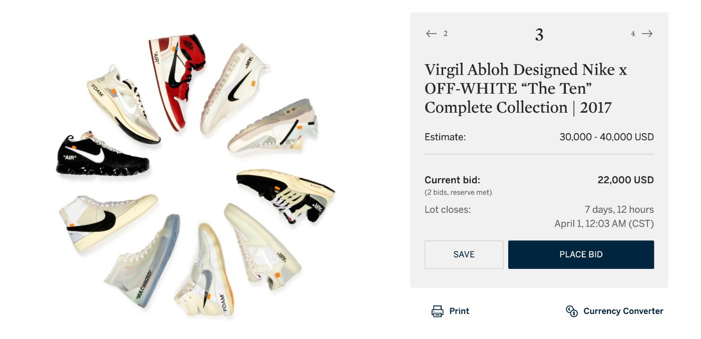 继此前苏富比拍卖 200 双限定版 Nike x LV「Air Force 1」后,Virgil Abloh 最深入人心的 OFF-WHITE x Nike「The Ten」近期又登上了苏富比「Modern Collectibles」拍卖会。