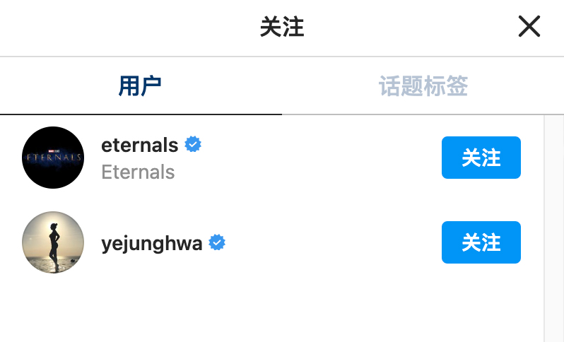 同时翻看马东锡的个人社交媒体,不难发现在他仅有的两个关注人当中,其中一个是漫威刚刚上映的电影《永恒族》,另一个就是芮呈和(yejunghwa)。