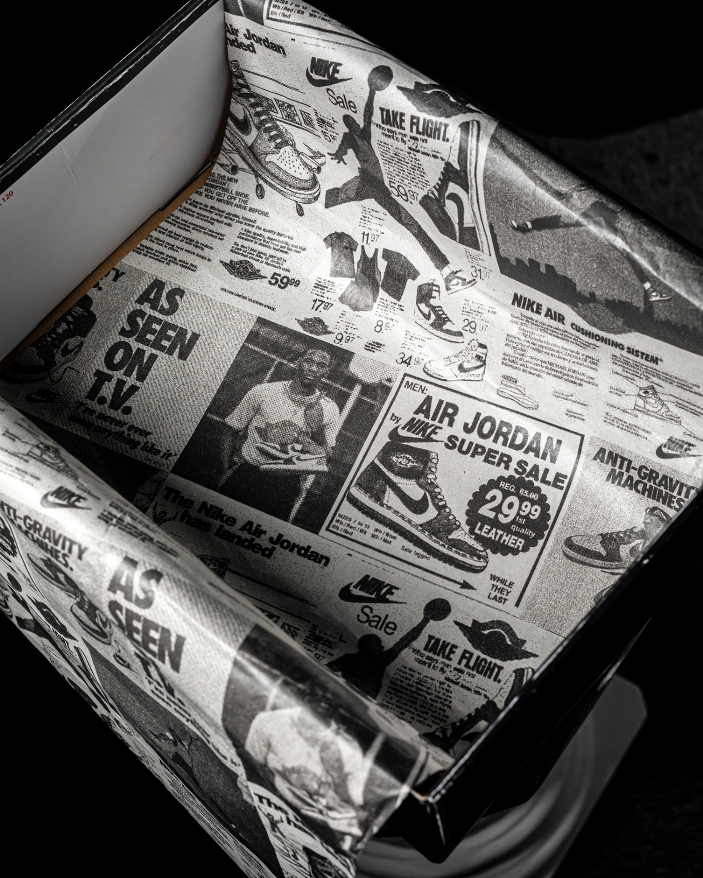 这还没完,打开鞋盒扑面而来的衬纸上,印刷着当年乔丹为 AJ1 拍摄的海报,以及当时推广的宣传页。
