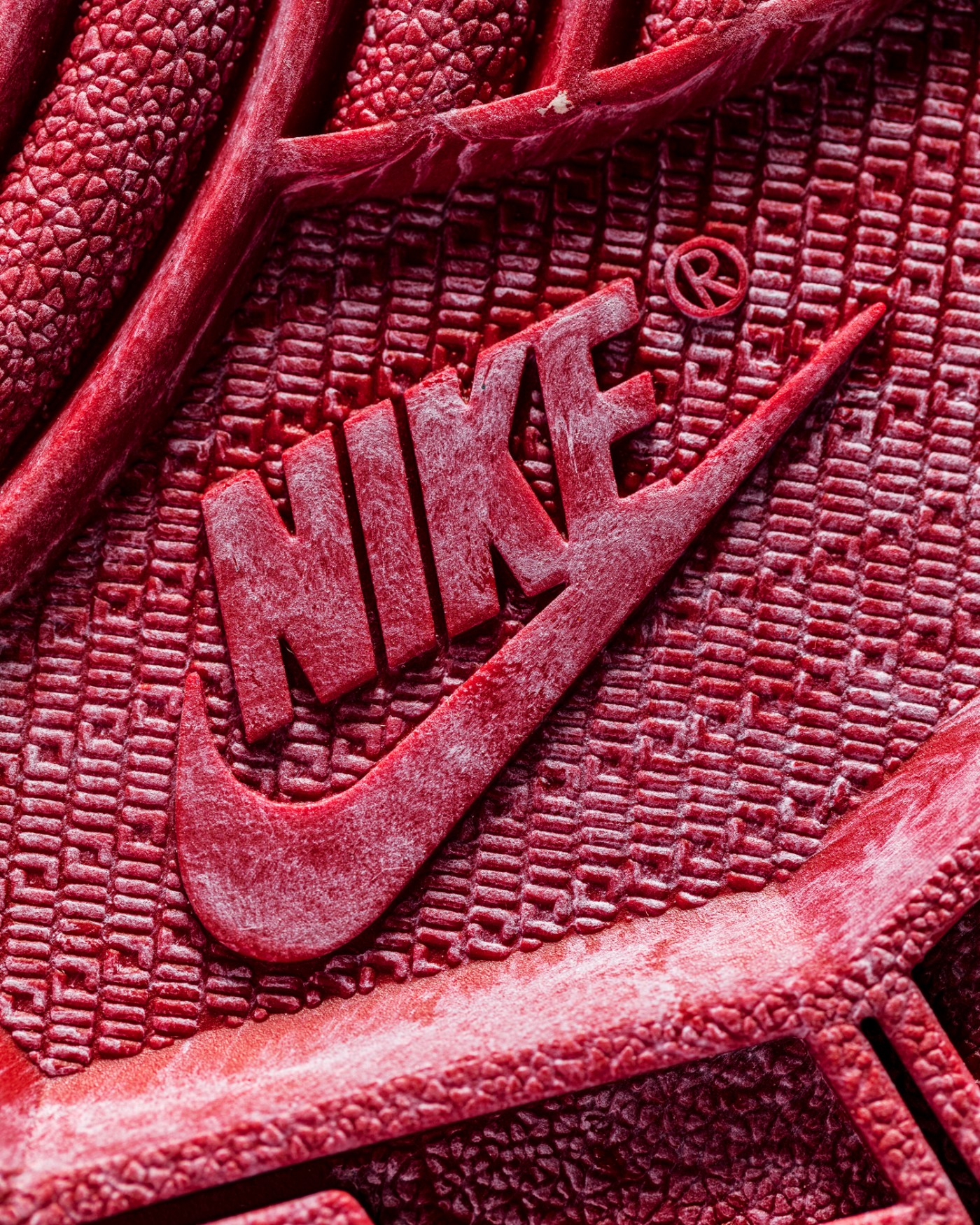分别体现在白色鞋面与后跟黑色皮革的龟裂纹理,鞋舌和中底部分的氧化泛黄,以及红色外底的粉化涂装。