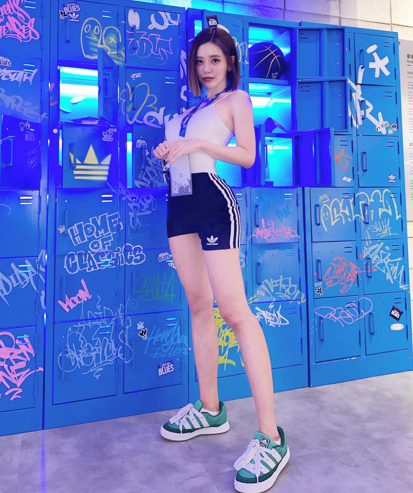 其实早在今年 6 月 Soda 就现身了三叶草活动,并身着一套紧绷运动套装和一双白绿配色 Adimatic,尽显火辣身材。