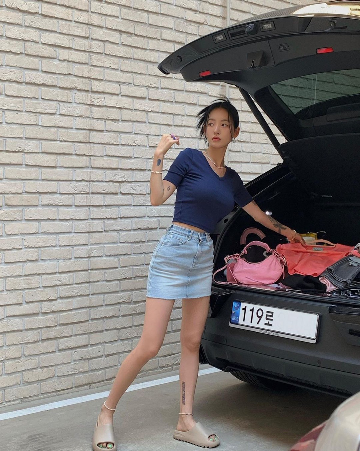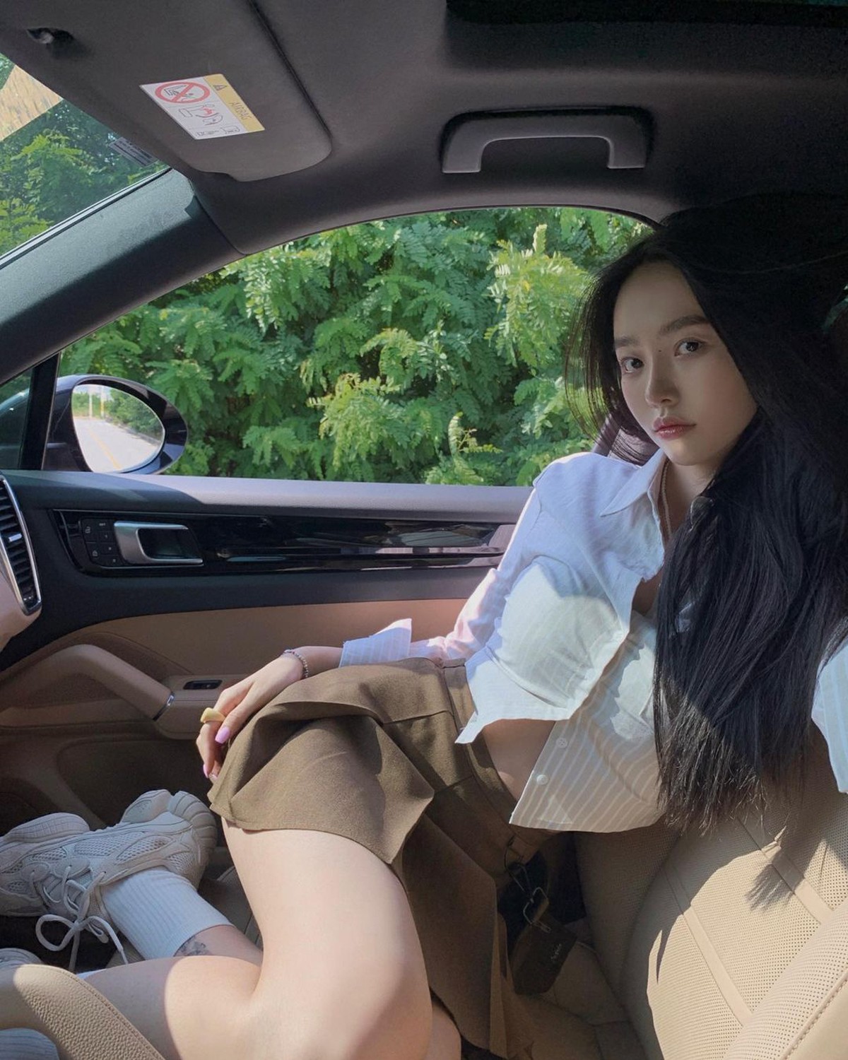 在车上还用长款 Legging 和克罗心经典长袜搭配 Nike Air More Uptempo Slide,这下我看看有谁说她是体育生穿搭!
