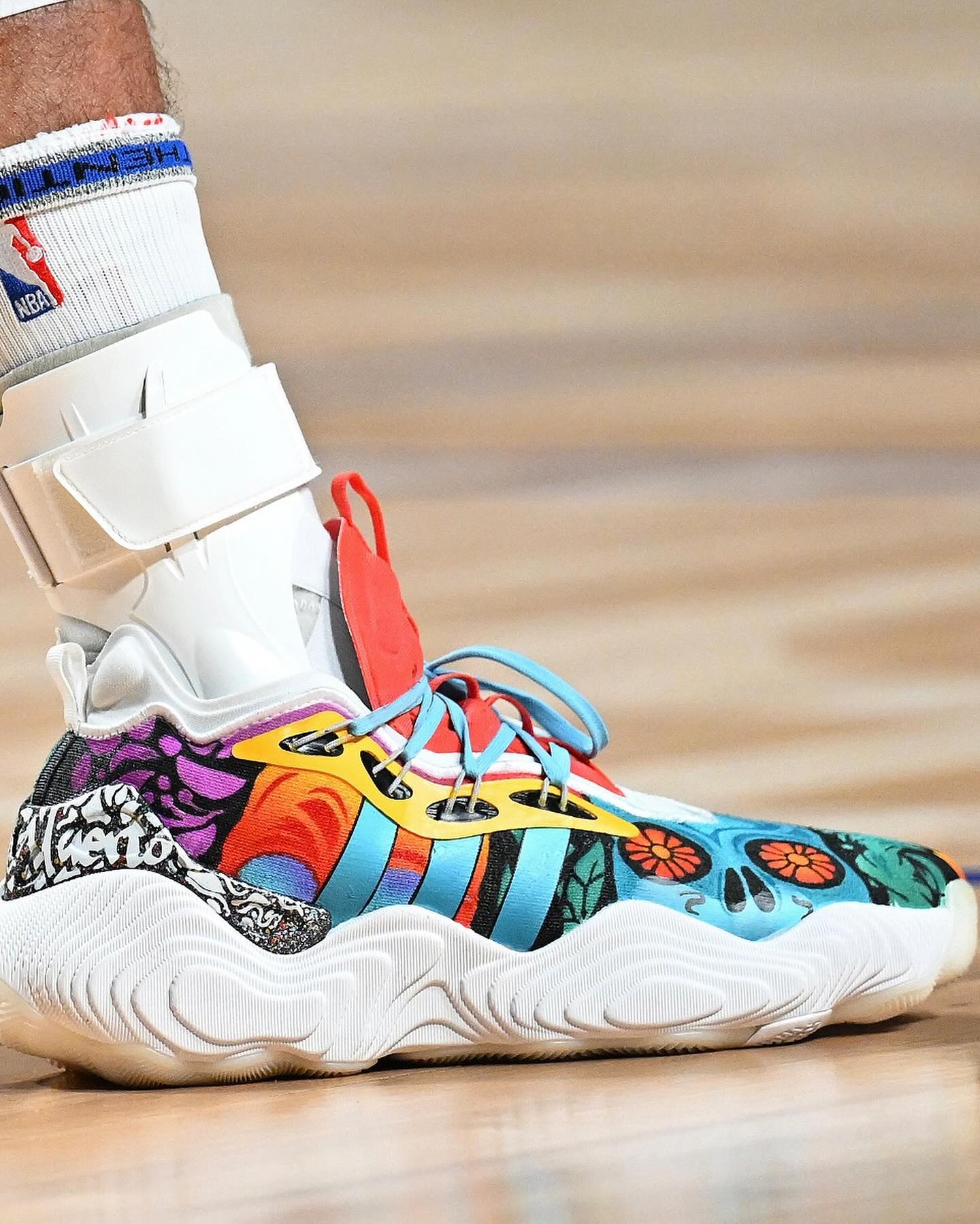 整双鞋以类似「墨西哥亡灵节」的主题进行创作,由此致敬传奇的「墨西哥城」,标志性的彩色花朵、骷髅头自然必不可少,因此视觉效果上相当醒目。