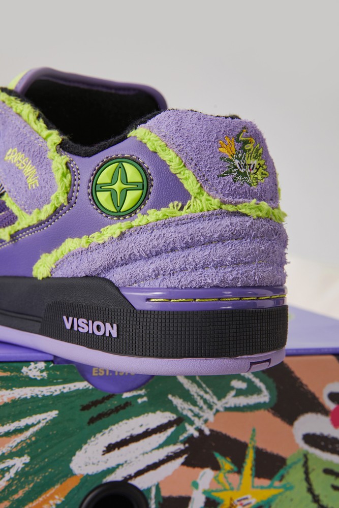 另一个与常规版本区别是,诞生于 2000 年的 VISION STREET WEAR 经典 FOOTWEAR 双 V 标志以绿色点缀,并在后跟位置融入彰显联名身份的刺绣图案。