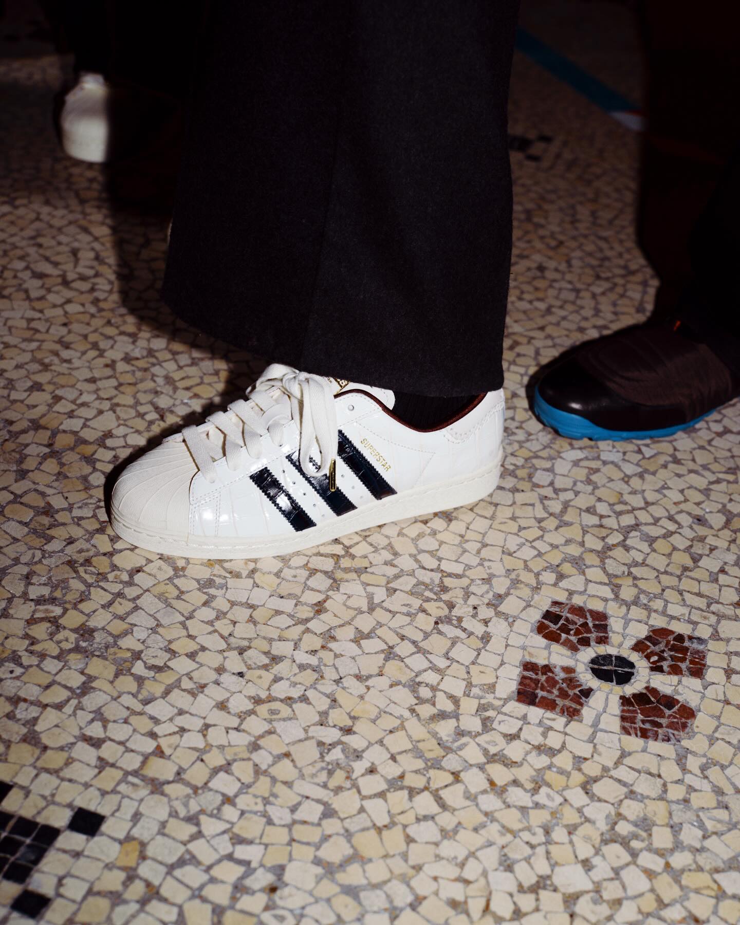 除了上脚过白红配色 Samba,跳「滑步舞」的时候穿的就是黑白配色 Superstar。