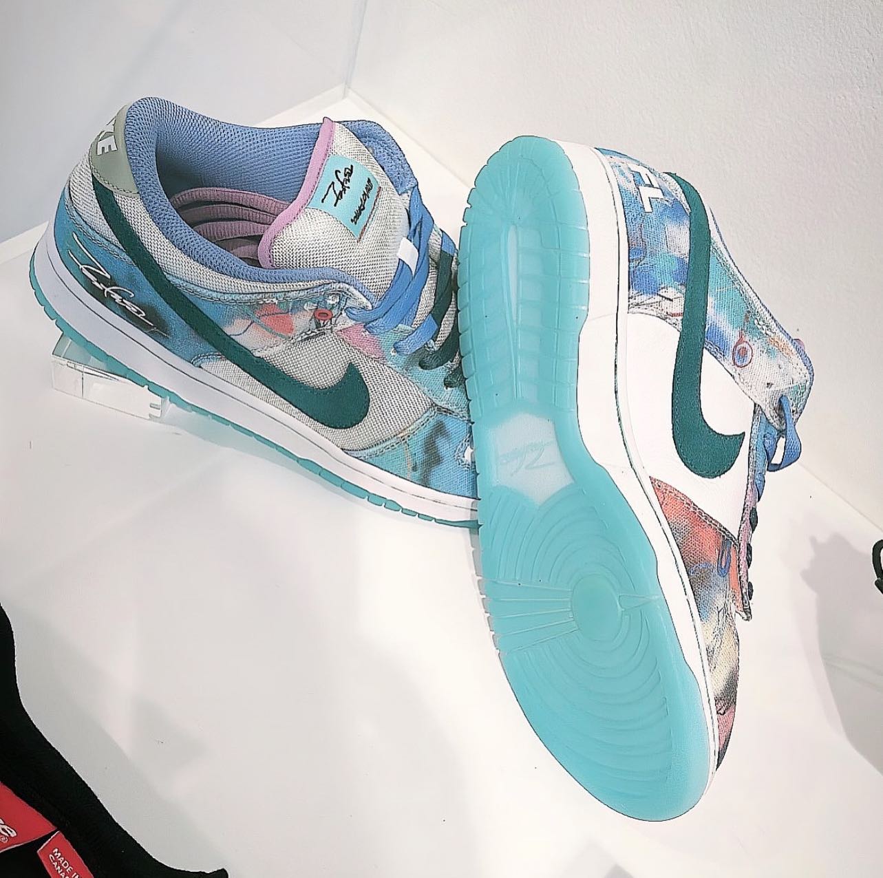 双方曾打造过一双  Futura x Nike SB Dunk High Pro,在苏富比以 $63000 美元的价格成交。