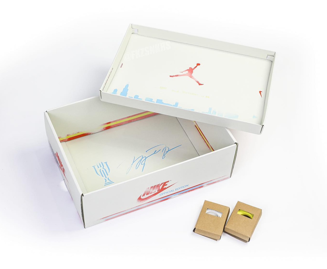 鞋盒方面,盒面上的 Nike Swoosh 用褪色处理,并印有 Trophy Room 以及乔丹签名。