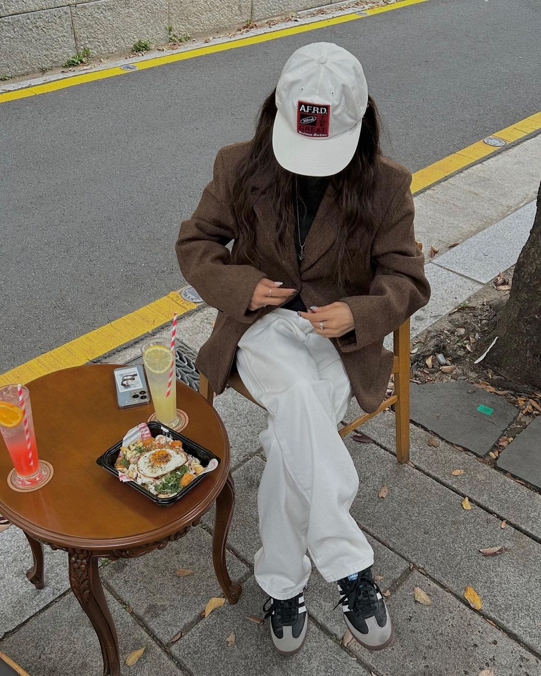 上身搭配一件棕色休闲西服夹克,下身则是宽松阔口的白色长裤,与脚上的 SAMBA 在色系上相呼应。