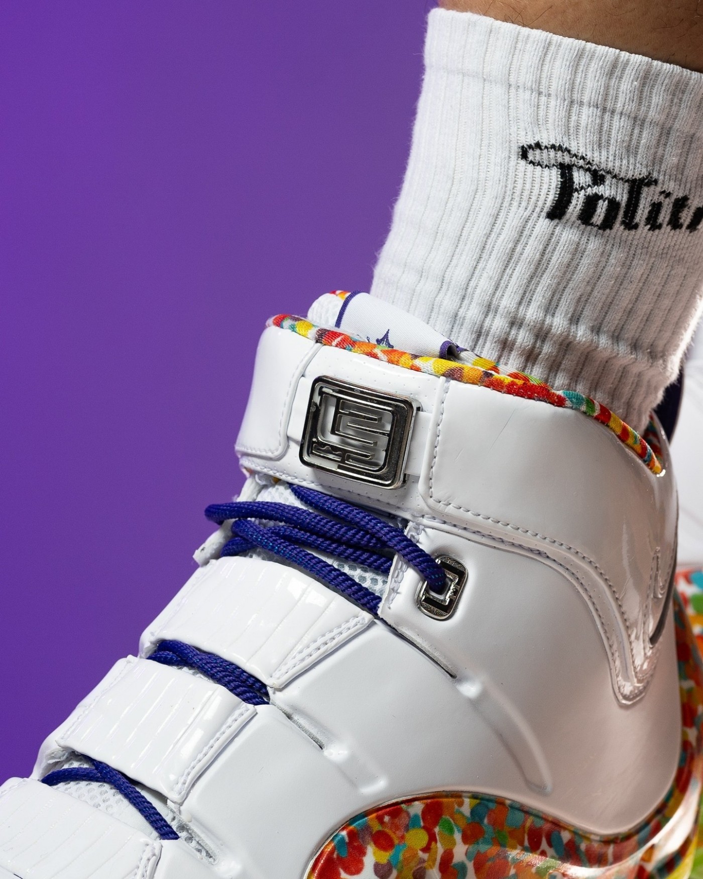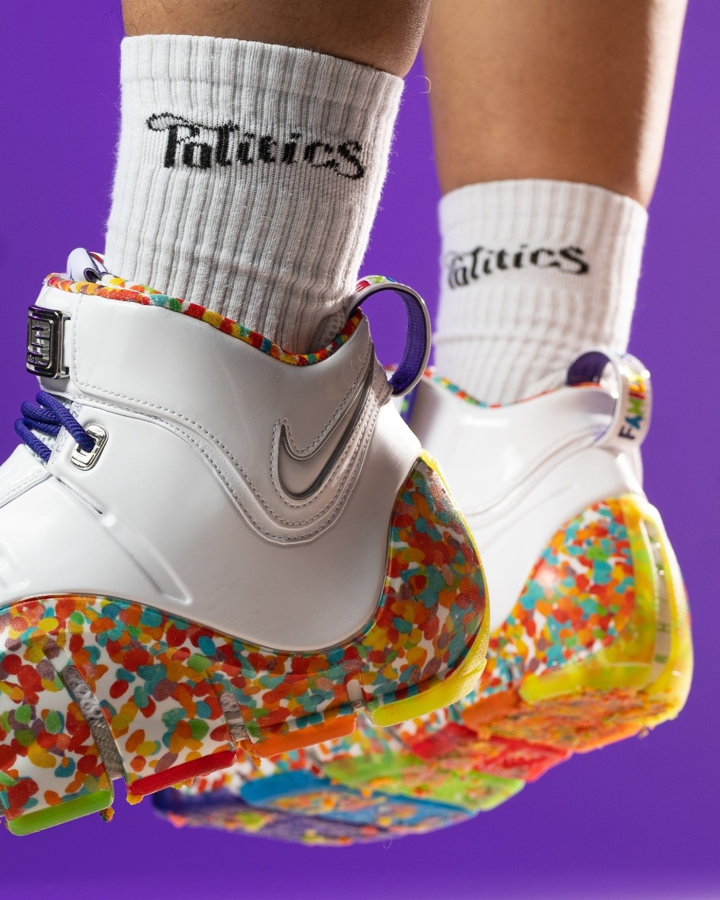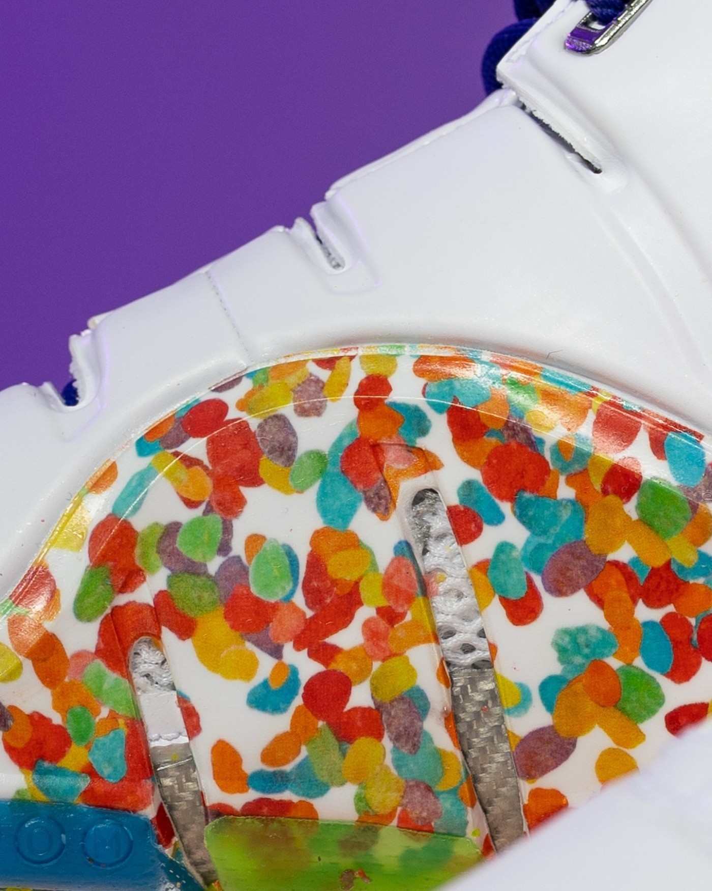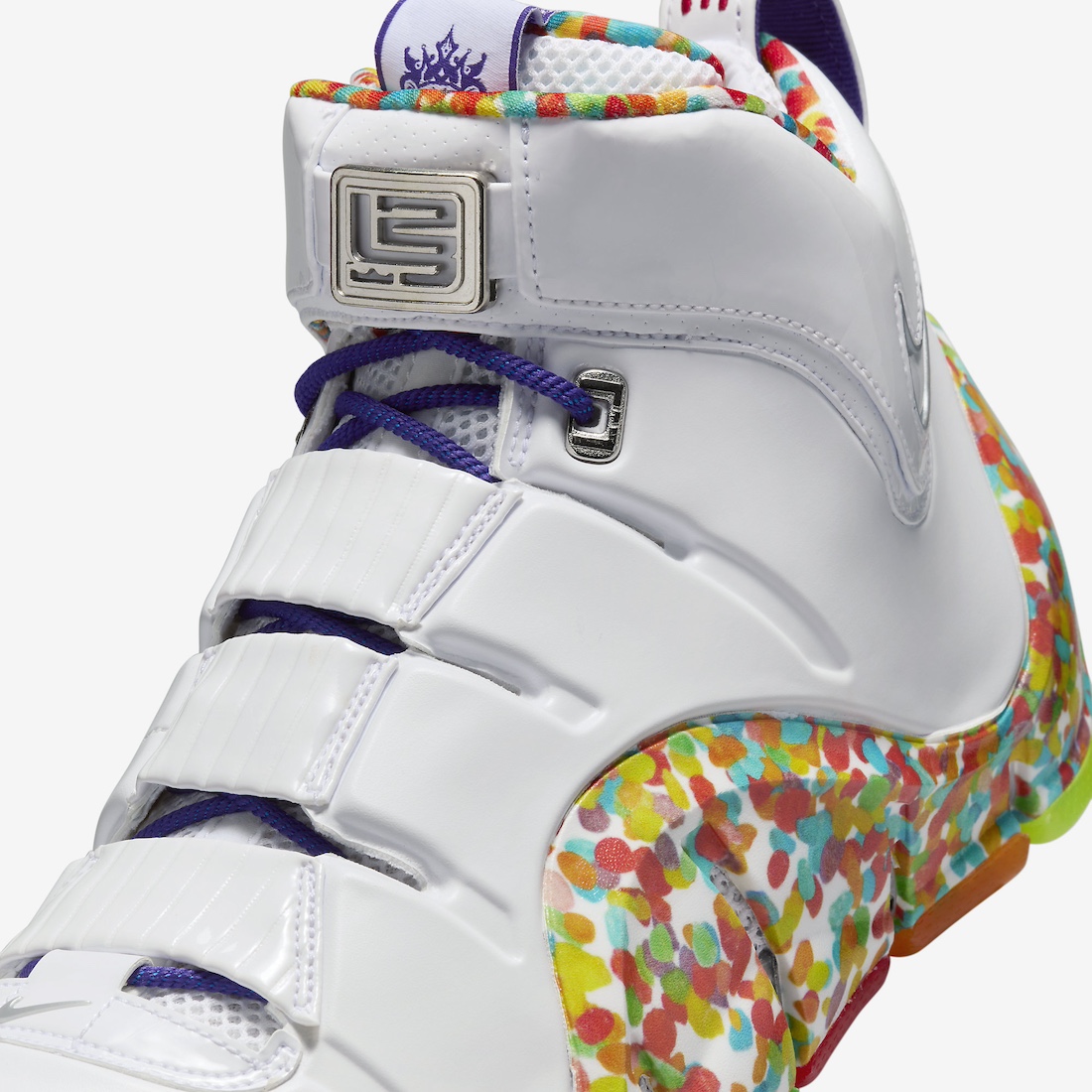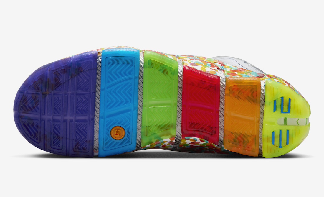 作为詹姆斯最深入人心的非市售 PE 配色之一,Fruity Pebbles 将美式水果麦片元素的缤纷色彩,注入 LeBron 4 标志性的乳白色发泡鞋身之上,还原牛奶冲泡麦片的熟悉场景。