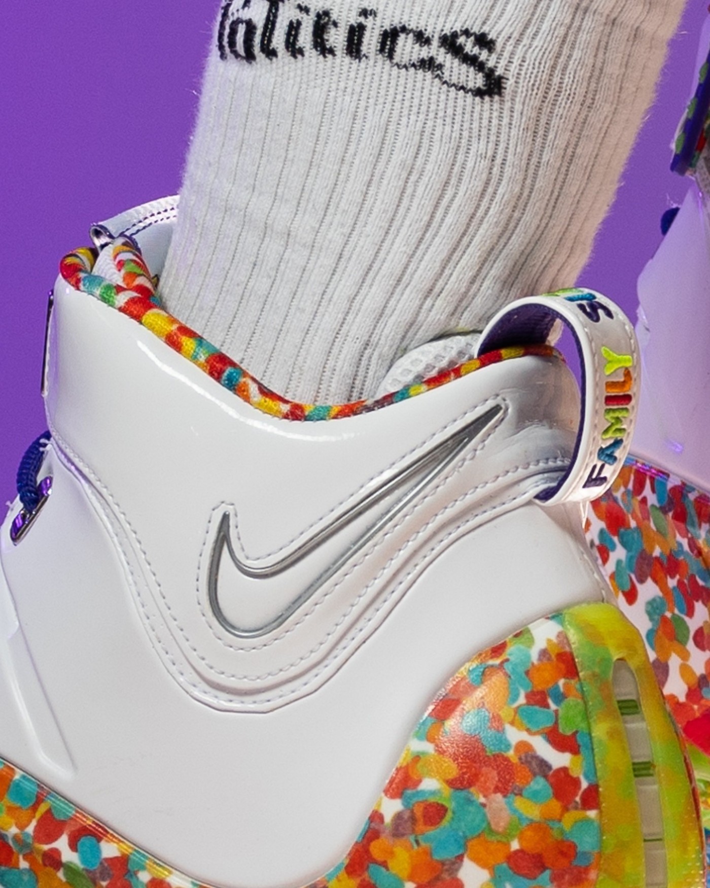 细节方面,鞋舌内侧采用卡通麦片元素呈现 Fruity Pebbles 字样和 LBJ 专属 Logo,鞋垫及内衬也采用与鞋身图案对应的多彩配色妆点,后跟鞋提的「Family Size」刺绣则呼应麦片包装上的全家装字样。