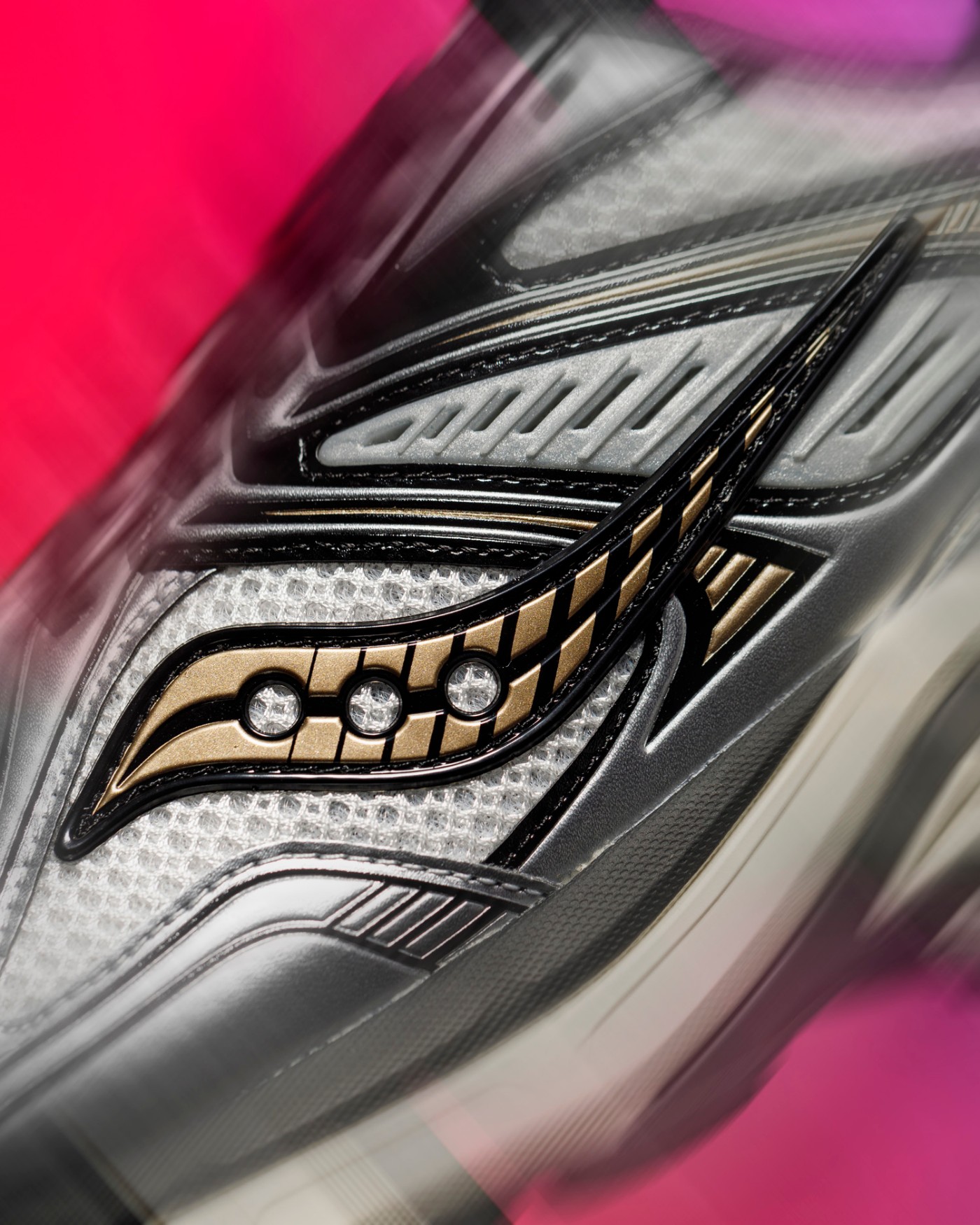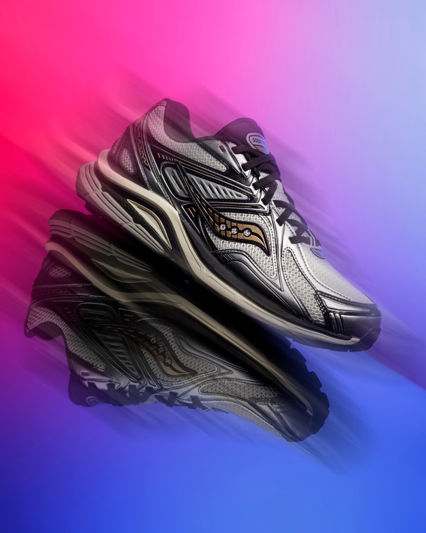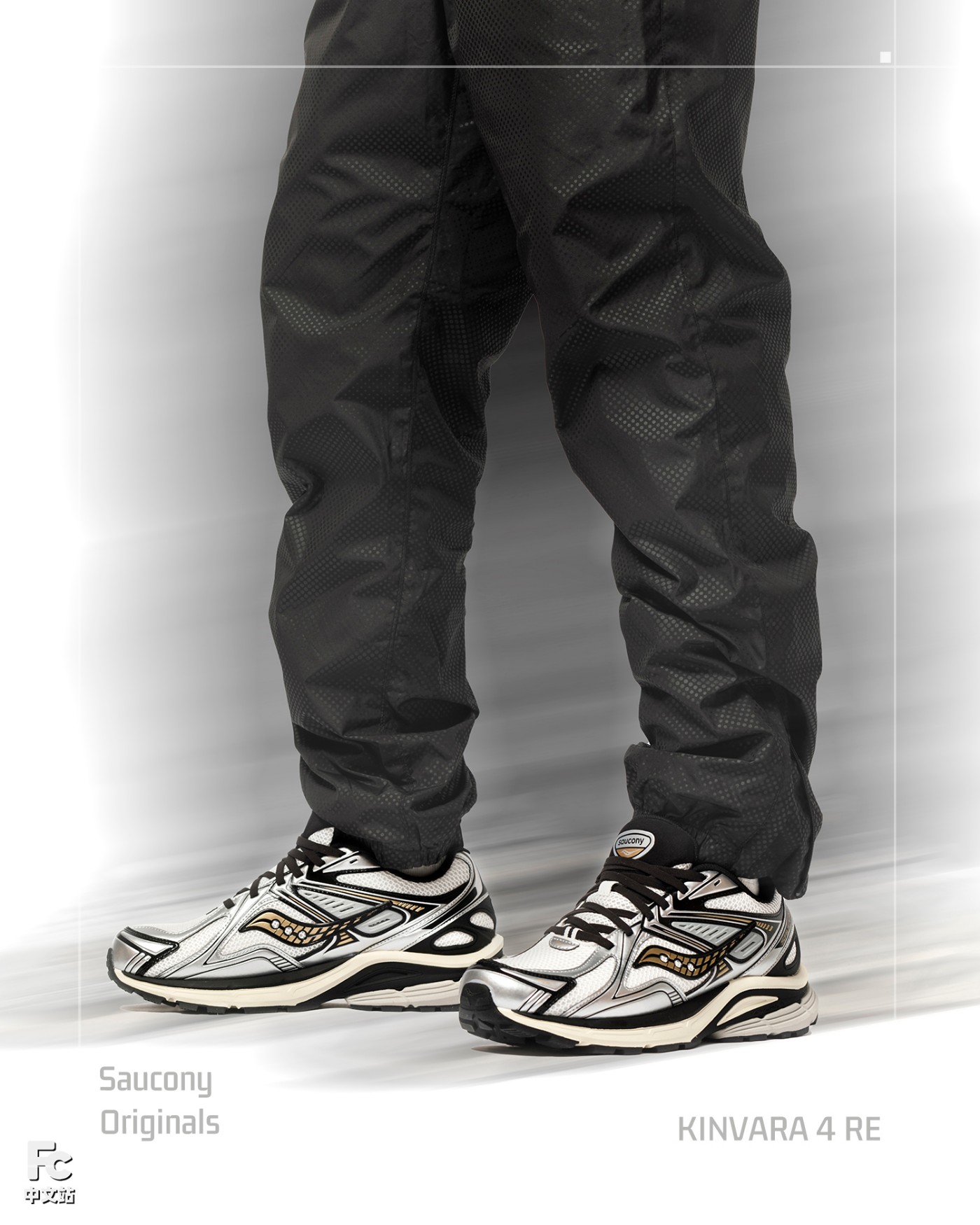 透气织物与真皮材质共同构建的银灰装扮,通过金属光泽营造的未来质感,完美衬托出金色索康尼 Logo 独有的优雅弧线。