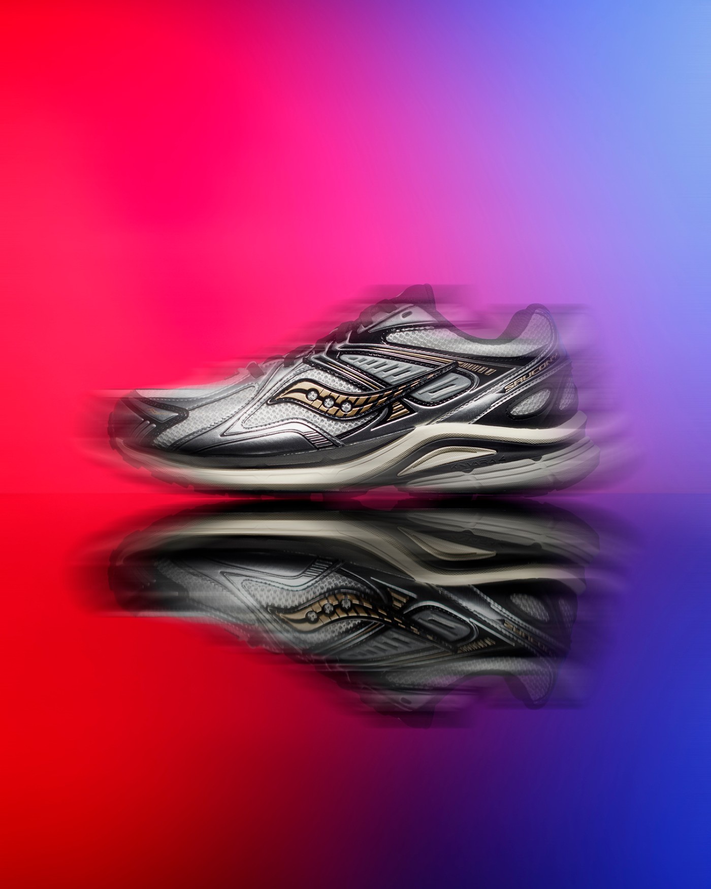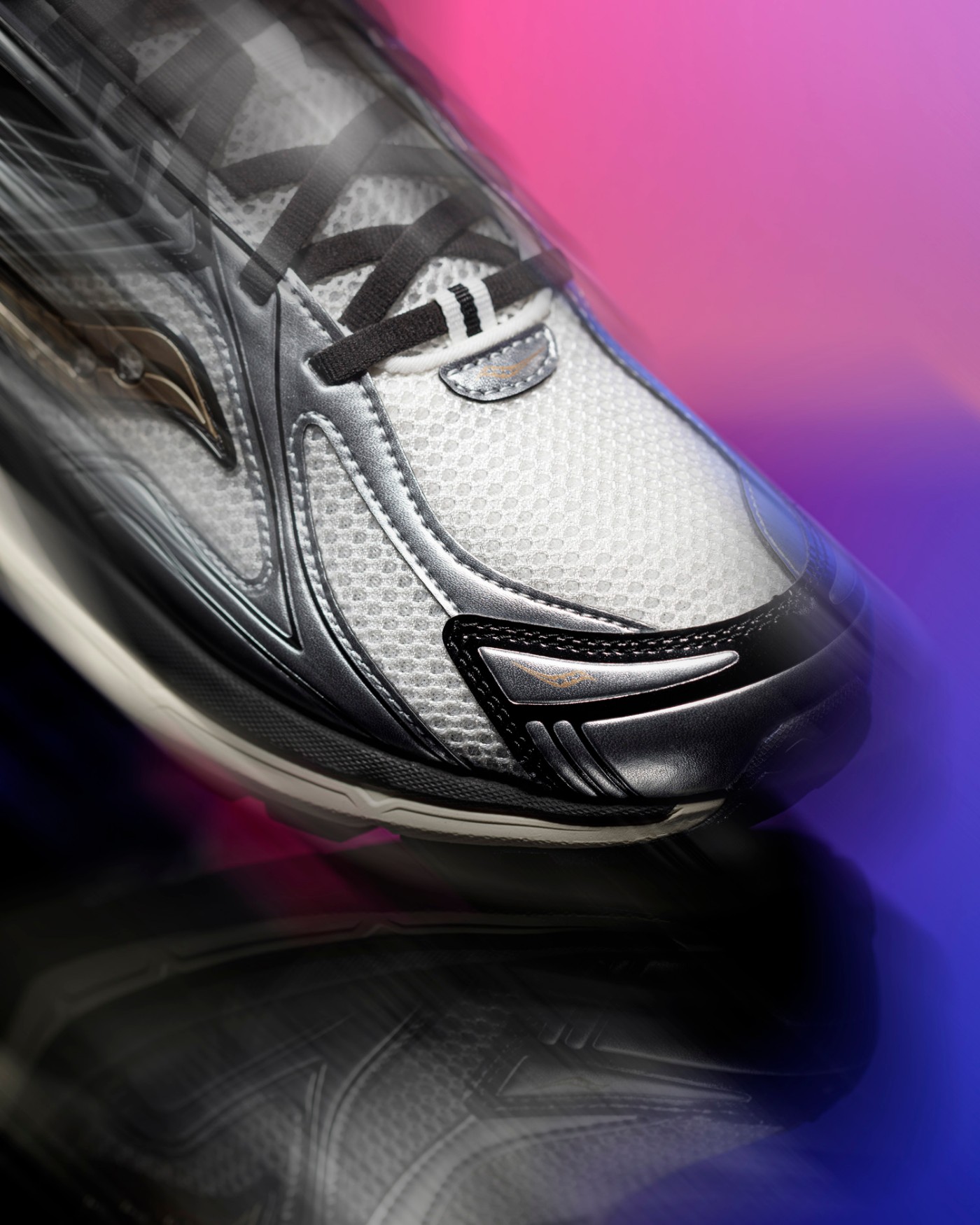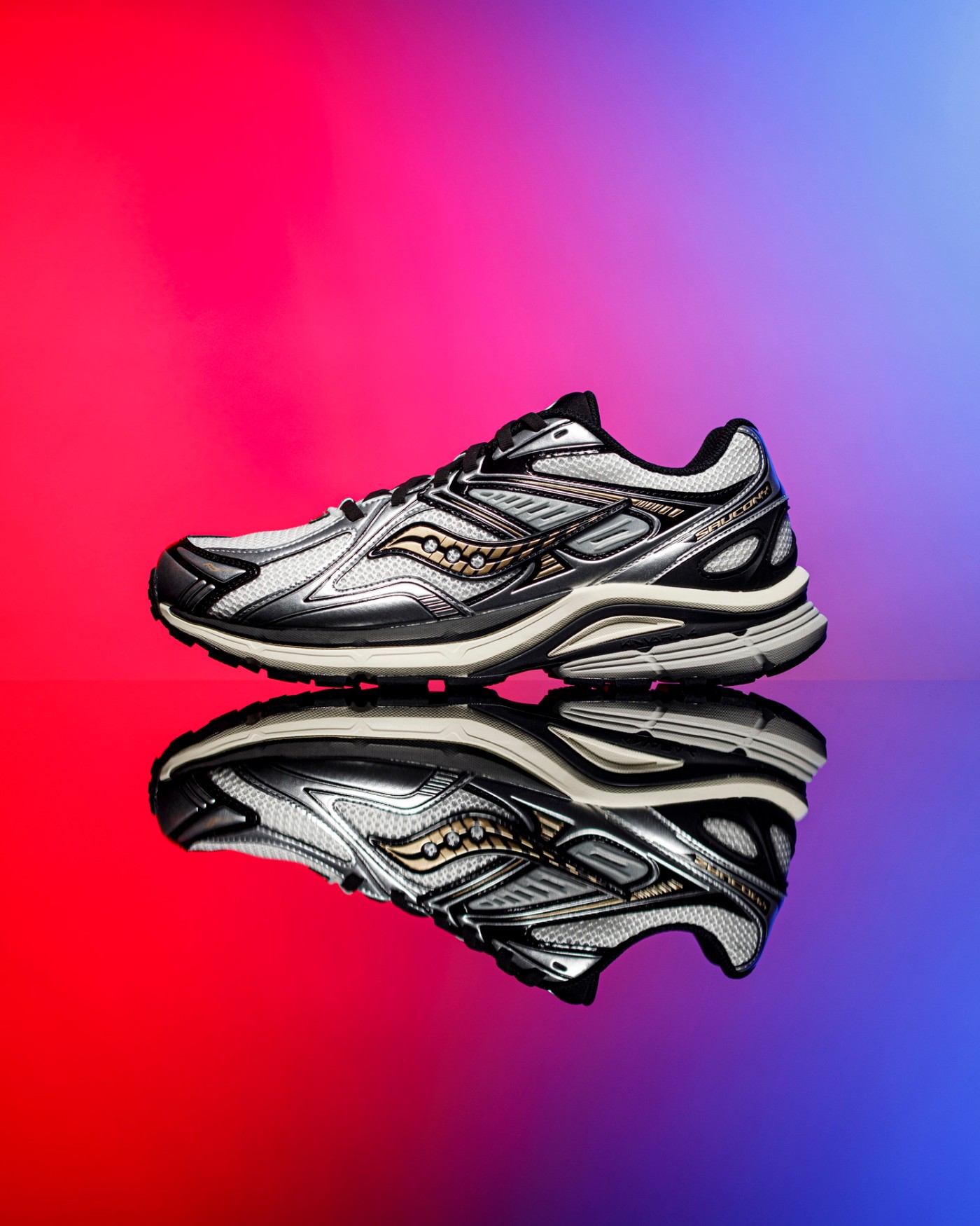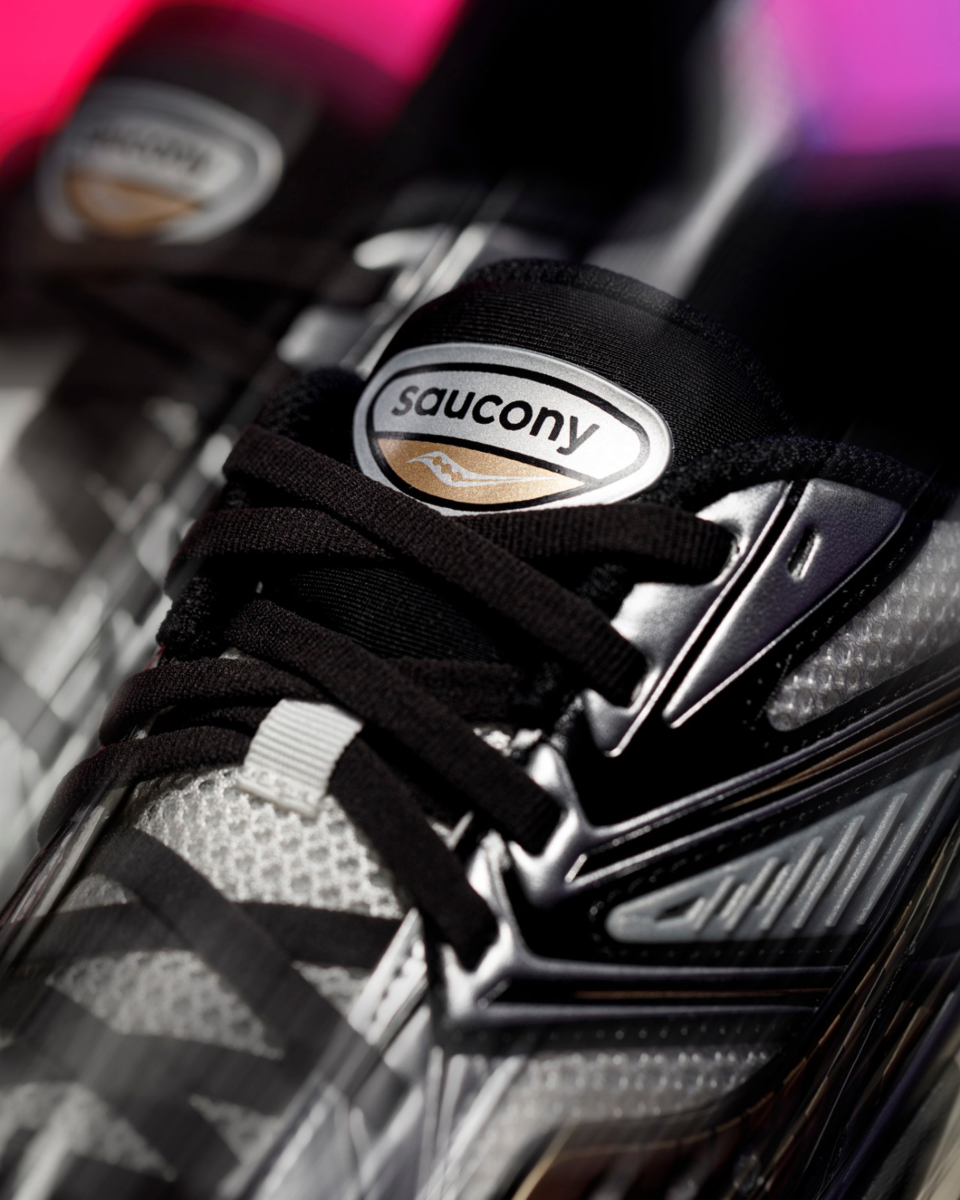 透气织物与真皮材质共同构建的银灰装扮,通过金属光泽营造的未来质感,完美衬托出金色索康尼 Logo 独有的优雅弧线。