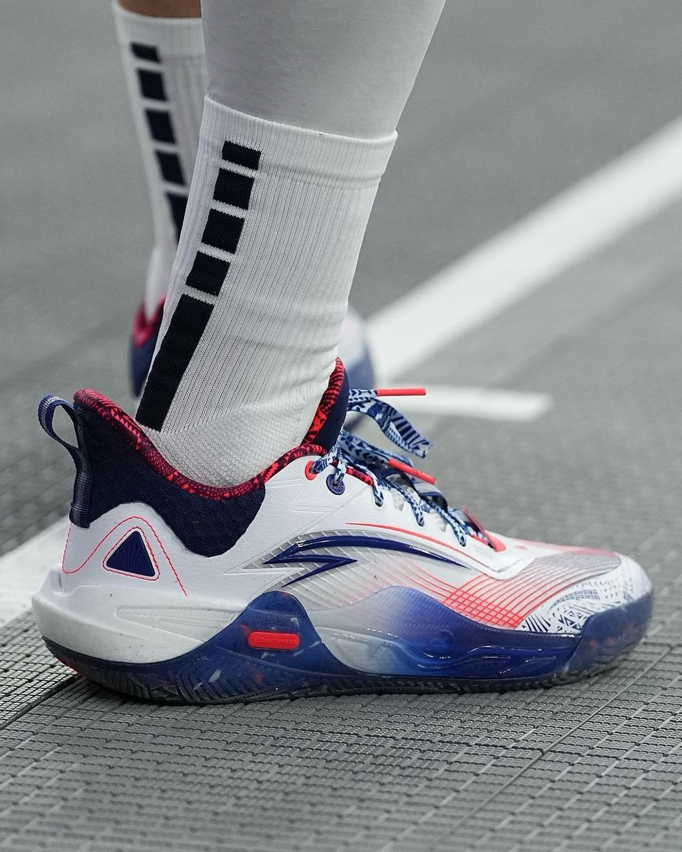 训练中不仅上脚了美国队主、客场配色的 ANTA KAI 1,还抢先穿上了未公开市售的「欧爸一代」ANTA KAI1 Speed。